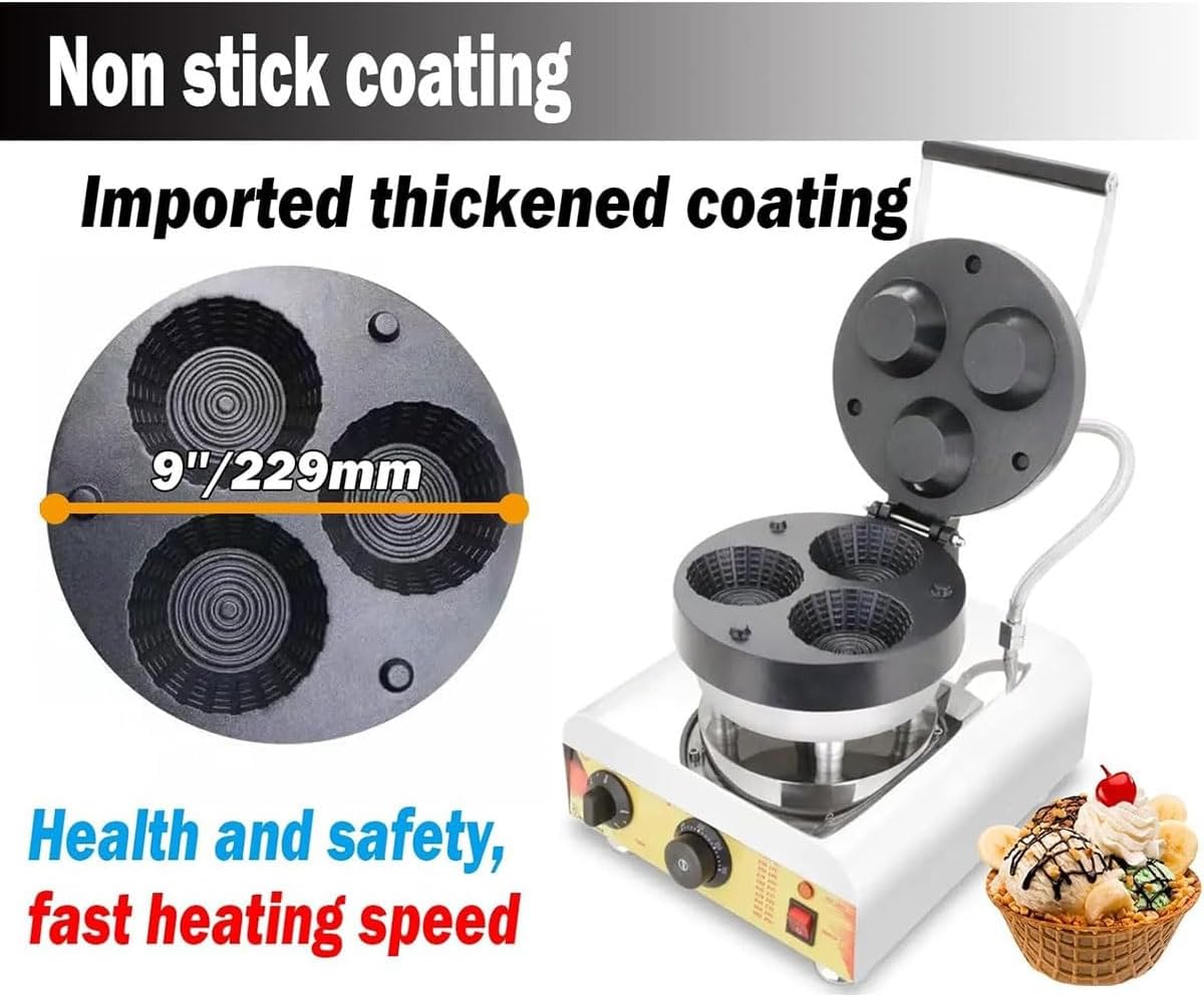 Create waffle bowls in just minutes! Ideal for busy kitchens that need to serve tasty treats quickly.Not only does it make delightful ice cream waffle bowls, but it can also be used to prepare unique tableware like burrito bowls, enhancing your menu options.Specifications:Name: Commercial Waffle MakerMaterial: Stainless SteelPower: 1600 WTemperature Range: 50-300 ℃ / 122-572 ℉Timer: 0-5 minutesWaffle Shape: BowlWaffle Size: 93.6 x 30.6 mm (3.6 x 1.2 inches)Size: 304 x 390 x 370 mm (11.9 x 15.3 x 14.5 inches)Machine Weight: 11 kg (24.2 lbs)Package list:1 x Waffle Bowl Maker MachineNote:1.Due to differences in light, environment, monitor, etc., it is normal that there is a certain color difference between the product and the picture.2.If you have any questions or concerns, please contact us! we will reply you within 24 hours!