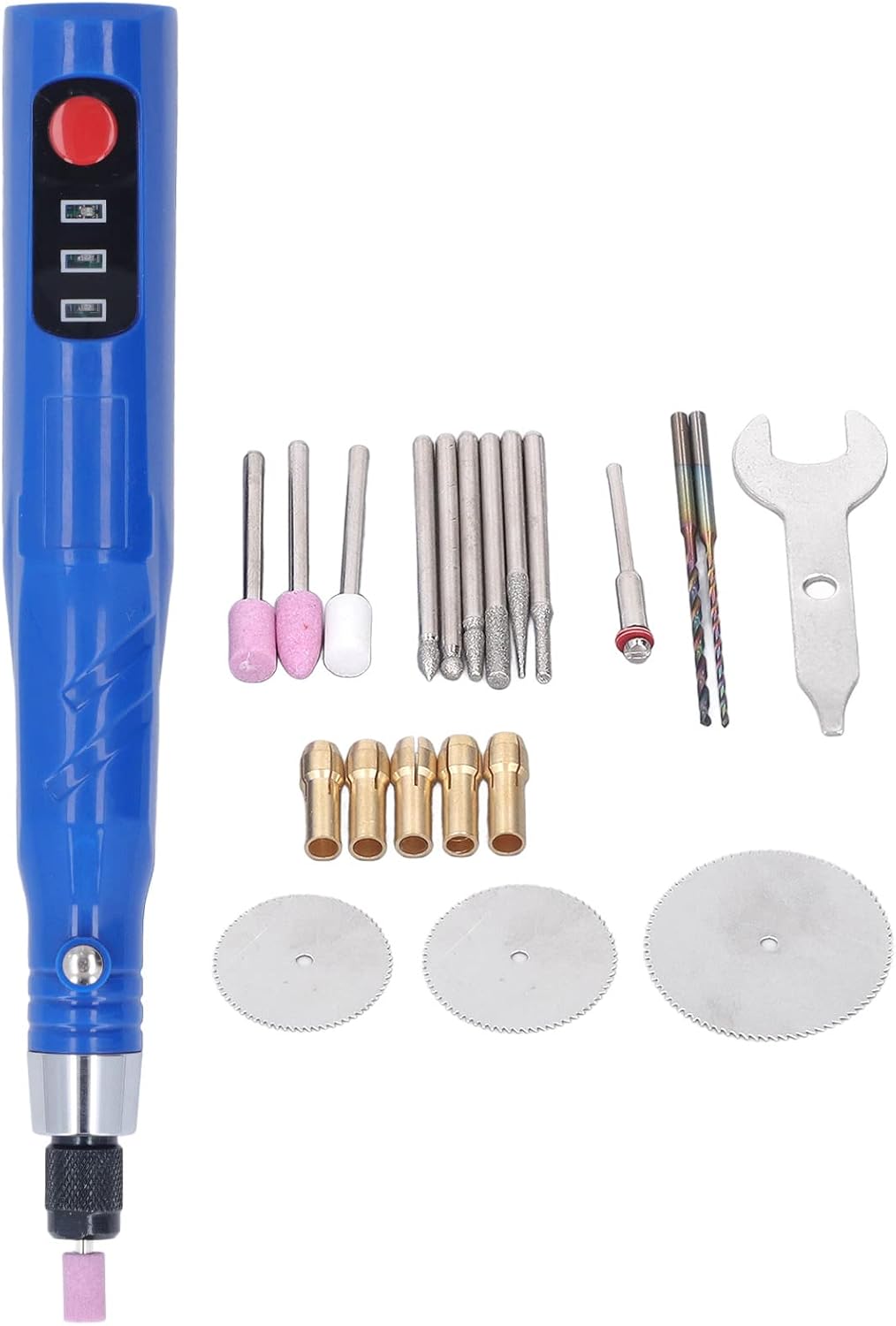 | Included Components | 1 x Electric Engraving Pen;6 x Grinding Head ;1 x Wrench ;5 x Collet ;1 x Wool Wheel; 2 x Grinding Wheel ;3 x Cutting Blade; 1 x Connecting Rod ;2 x Drill Bit ;1 x USB Cable |