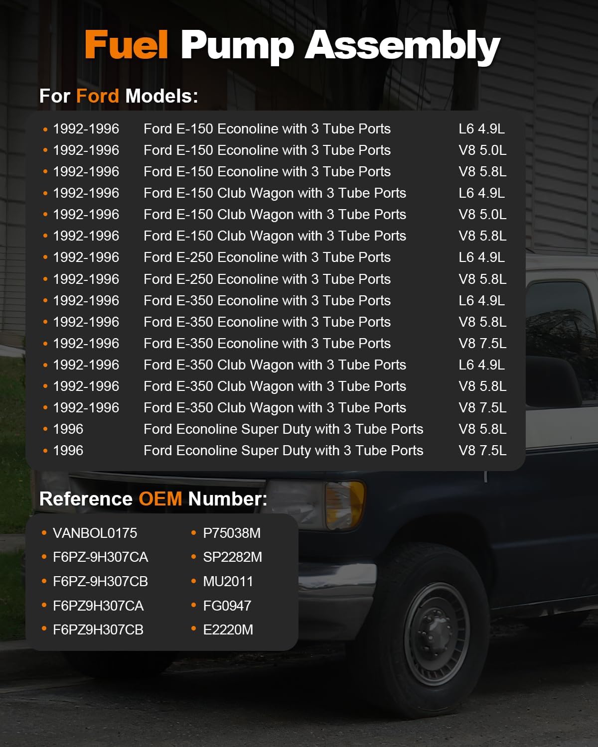 | Product Style | Compatible with 1992-1996 Ford E-150 Econoline L6 4.9L V8 5.0L 5.8L, 1992-1996 E-150 Econoline Club Wagon L6 4.9L V8 5.0L 5.8L, 1992-1996 E-250 Econoline L6 4.9L V8 5.8L, 1992-1996 E-350 Econoline L6 4.9L V8 5.8 7.5L, 1992-1996 E-350 Econoline Club Wagon L6 4.9L V8 5.8L 7.5L, 1996 Econoline Super Duty V8 5.8L 7.5L |