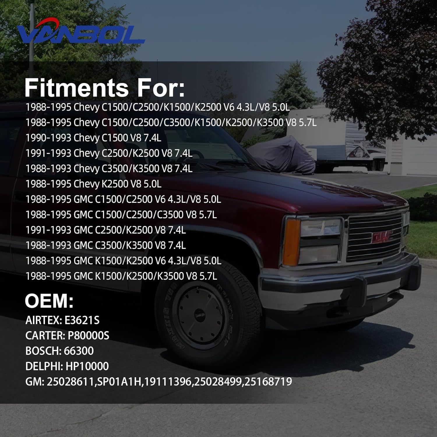 | Item Type Name | Fuel Pump Assembly for 1988-1995 Chevy C1500/C2500/K1500/K2500 V6 4.3L/V8 5.0L 1988-1995 Chevy C1500/C2500/C3500/K1500/K2500/K3500 V8 5.7L 1990-1993 Chevy C1500 V8 7.4L 1991-1993 Chevy C2500/K2500 V8 7.4L 1988-1993 Chevy C3500/K3500 V8 7.4L 1988-1995 Chevy K2500 V8 5.0L 1988-1995 GMC C1500/C2500 V6 4.3L/V8 5.0L 1988-1995 GMC C1500/C2500/C3500 V8 5.7L 1991-1993 GMC C2500/K2500 V8 7.4L 1988-1993 GMC C3500/K3500 V8 7.4L 1988-1995 GMC K1500/K2500 V6 4.3L/V8 5.0L 1988-1995 GMC K1500/K2500/K3500 V8 5.7L |