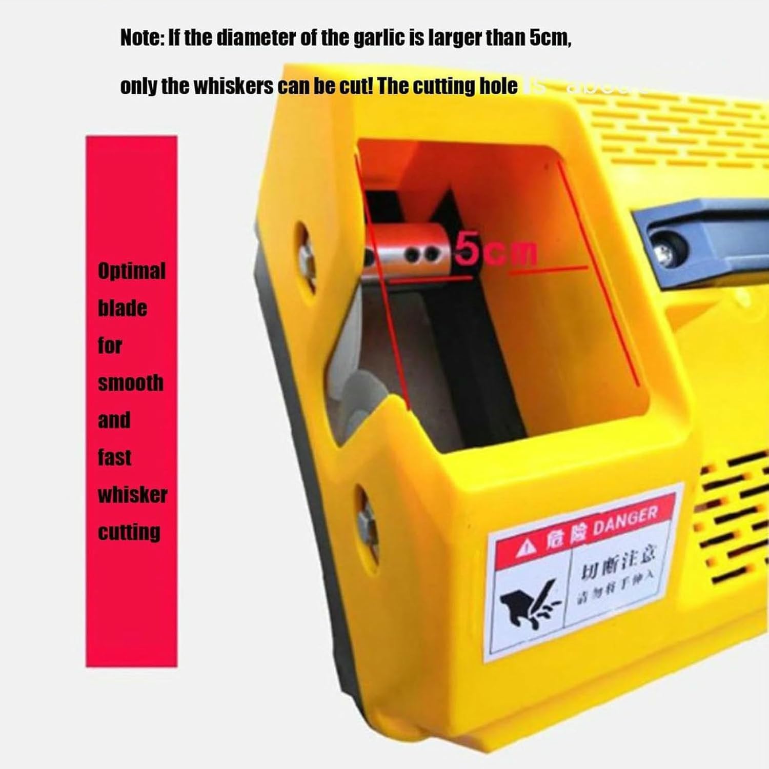 Bilateral Garlic Root Stem Cutter, Garlic Root Cutter,Double Head Garlic Top Tails Remover Machine, Agricultural Equipment Efficient Cutting Fresh Garlic Root StemSpecification: Material: Stainless Steel Color: Yellow Power: 48V - Need to connect 48V battery (not included) Size: 380 * 240 * 195mm Weight: 5.5KG Package Size: 390 * 250 * 205mm Weight: 6KGPackage includes: 1 * Bilateral Garlic Root Stem Cutter NOTES:Before use, you must wear cut-resistant gloves! And carefully check the machine logo! Very suitablegarlic farmer efficient cutting fresh garlic root stem, quick harvest garlic
