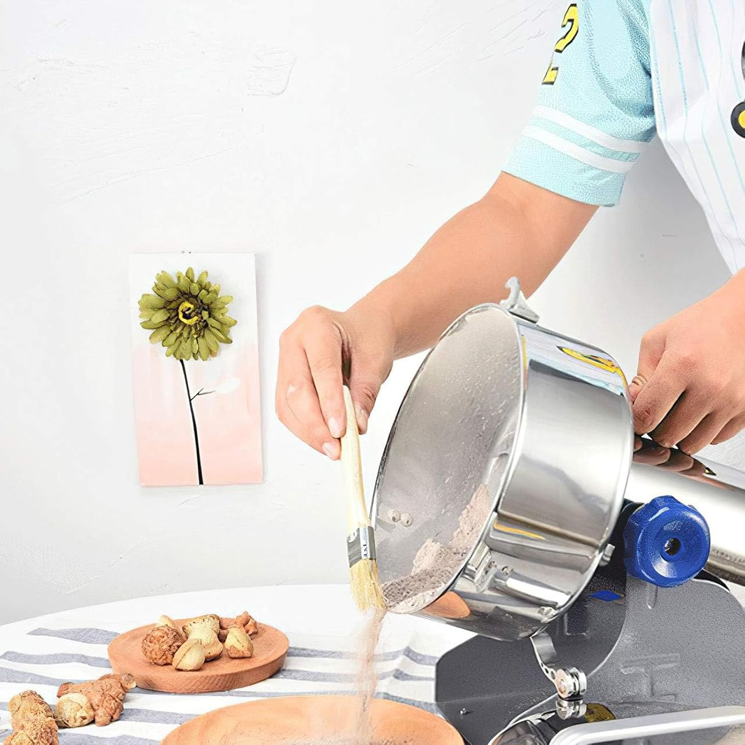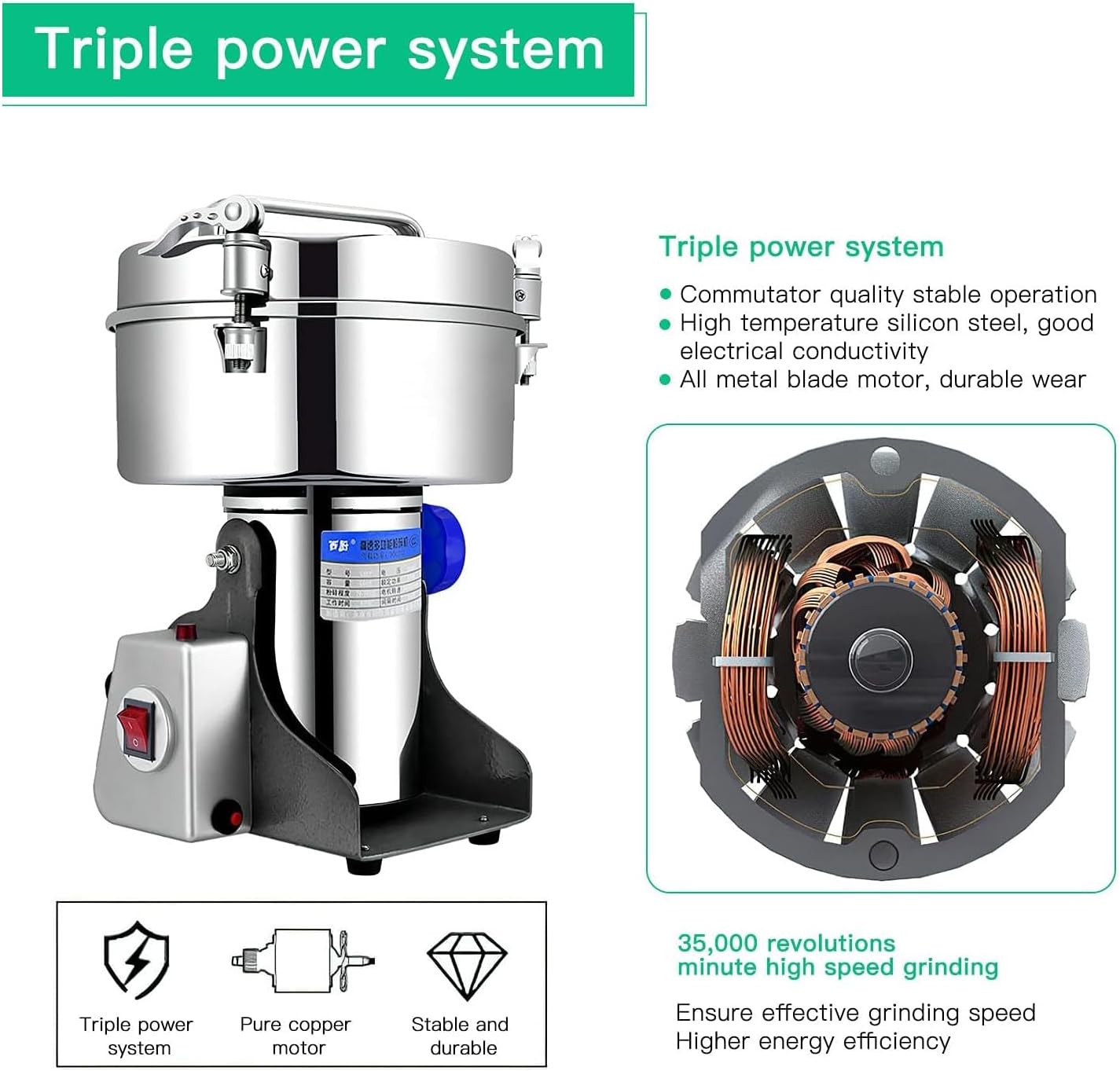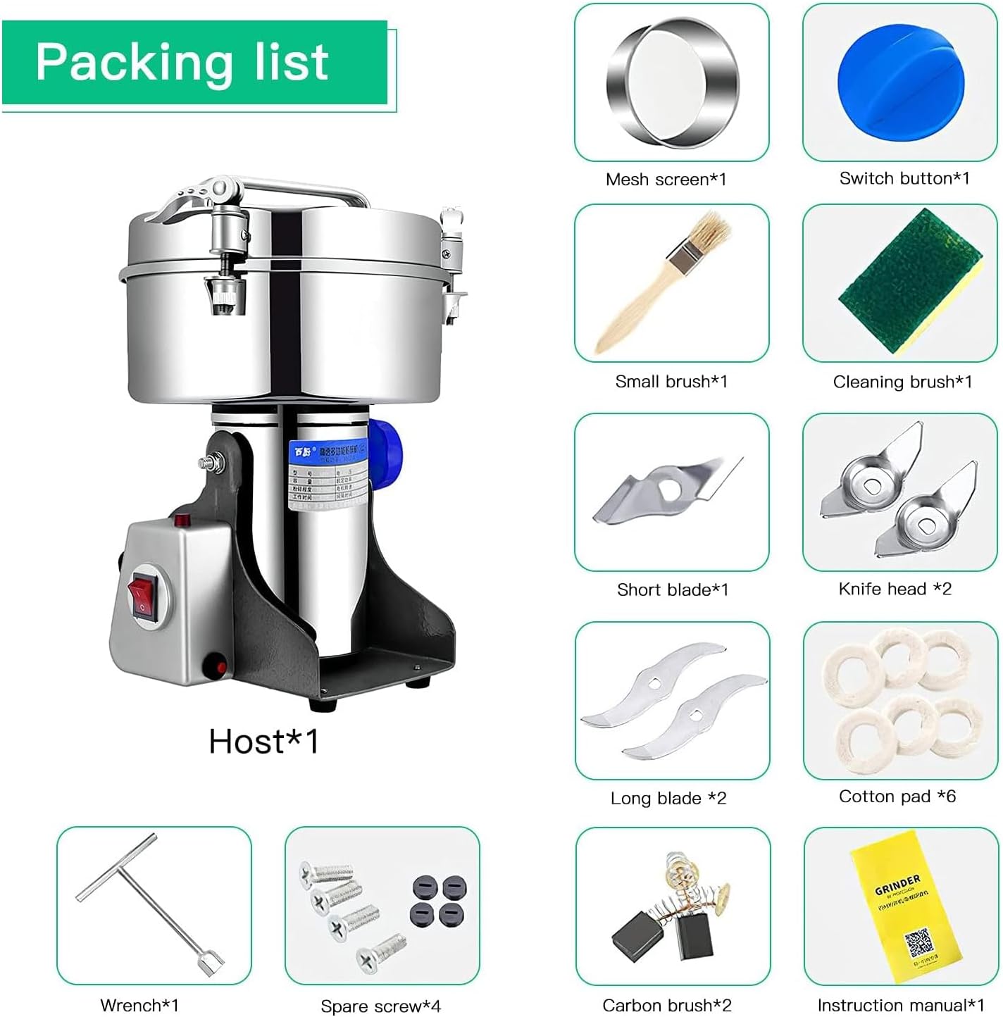 Specification: Power supply: 220V 50Hz Working time: 0-5 minutes Interval time: 5-10 minutes 600g: Capacity: 600g Rated power: 1400W Load power: 3000W Speed: 30000r/min Size: 36*16.3*22.8cm Caliber: Φ12.8cm Net weight 4.5 kg 800g: Rated power: 1400W Maximum load power: 3000W Speed: 34000r/min Caliber: 15.5cm Size: 36*17*22.8cm Net weight 4.2 kg 1000g: Capacity: 1000g Rated power: 1600W Load power: 3200W Motor speed: 35000r/min Crushing degree: 70-300 mesh Size: 36*13.5*18.5cm Caliber: Φ21cm Gross weight: 6.9kg 2000g: Capacity: 2000g Rated power: 1800W Maximum load power: 4000W Speed: 37000r/min Size: 36*13.5*18.5cm Caliber: Φ20.5cm Net weight 6.9 kg 2500g: Rated power: 1800w Maximum load power: 4500W Speed: 39000r/min Size: 37*13.5*18.5cm Caliber: 21cm Net weight 7.1 kg 3500g: Capacity: 3500 grams Rated power: 2000W Maximum load power: 4500W Speed: 41000r/min Size: 37.5*13.5*18.5cm Caliber: Φ25.5cm Net weight: 9.7 kg 4500g: Capacity: 4500 grams Rated power: 2000W Maximum load power: 4500W Speed: 4300r/min Size: 37.5*13.5*18.5cm Caliber: Φ25.5cm Net weight 9.9 kg Due to the light from the shooting angle, the color may have some deviations. Manual measurement of the size may have an error of 1-2cm, I hope to understand. Contact us: If you have any questions or needs, you can contact us at any time.