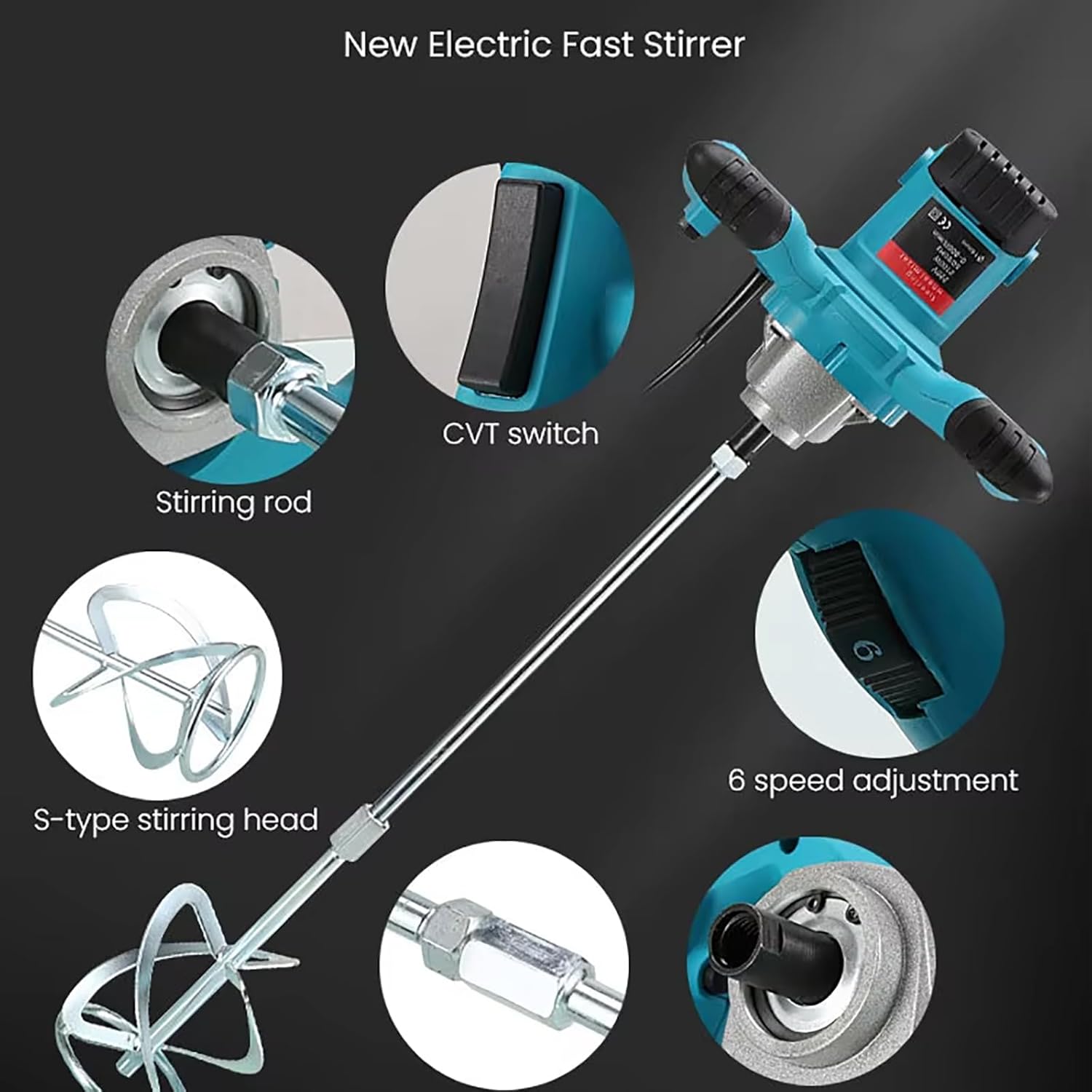 - **Product Name:** Electric Cement Mixer - **Rated Voltage:** 110V-240V - **Rated Power:** 2100W - **Speed Settings:** 6 gears - **Number of Oars:** Double oars - **No-Load Speed:** 0-800 rpm **Package Includes:**- Electric Mortar Mixer x 1 **Notes:**Please allow for slight color variations due to lighting during photography, and a measurement error of 1-3 cm due to manual measurement.