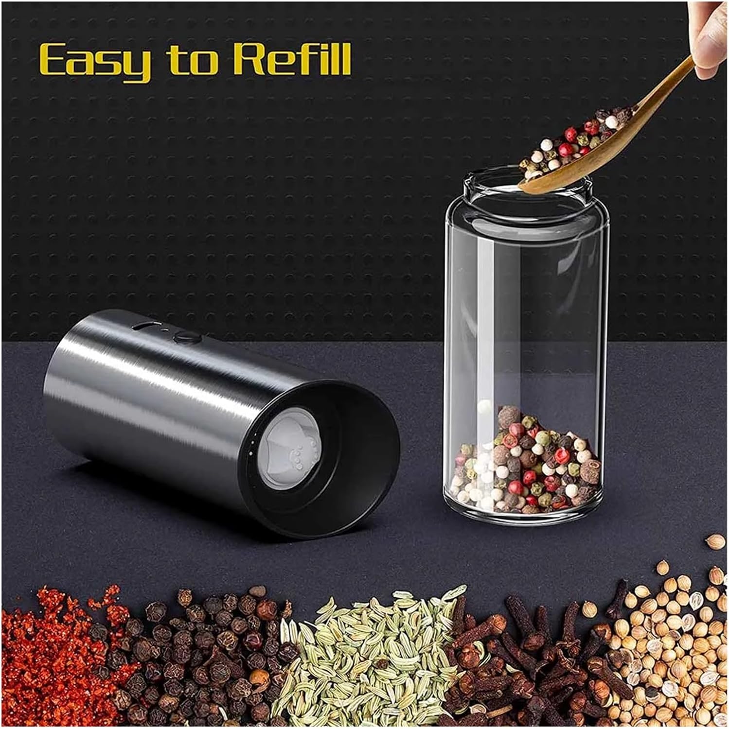 New Upgrade Portable Electric Pepper Grinder USB Charge Profession , Ceramic Grinding CoreProduct introductioncapacity: 1200mAhV: 3.7VCharging time: 2 hoursCharging V: DC5V 0.5AContinuous working time: 1.5-2 hoursPower: 3WQuantity:1 pcs / 1 set = 2 pcs==========Material : MetalMills Type : Salt & Pepper MillsType : MILLSMaterial : Stainless steel + glassModel Number : USB charging pepper grinder