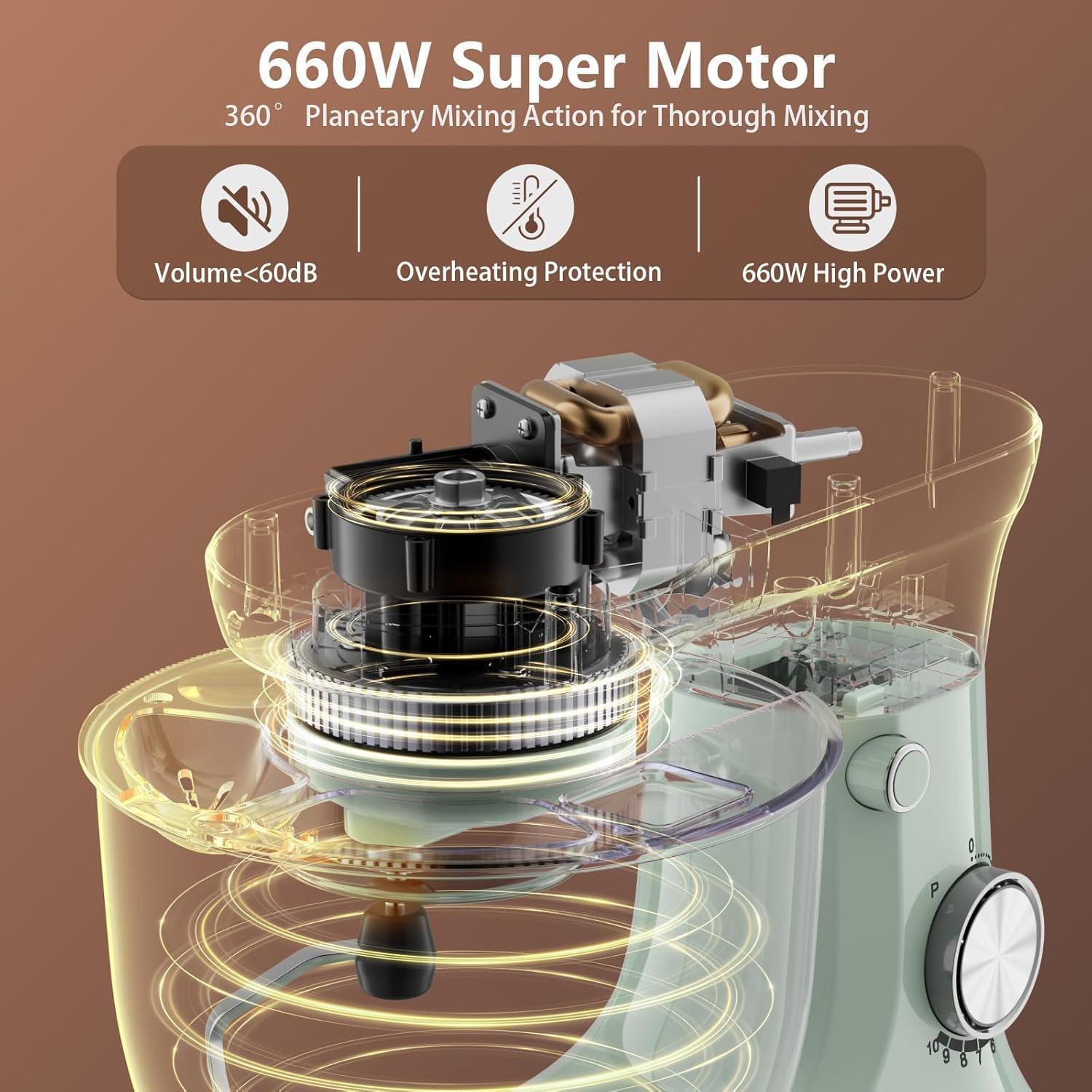 Electric Stand Mixer is designed for mixing a wide variety of foods ranging from beaten egg whites to bread dough. A powerful motor is pro-designed for your kitchen need. 10-speed mixer for all your food preparation needs. I. Product Overview electric mixer is a powerful assistant in the kitchen, combining multiple functions to bring you a convenient and efficient cooking experience. II. Parameters 1. Power: 660W. 2. Capacity: 6QT 3. Dimensions: 365 x 230 x 343MM. 4. N.W.: 4.5 KG. G.W.:3.7 KG 5. Colour: Black, green, red, pink.