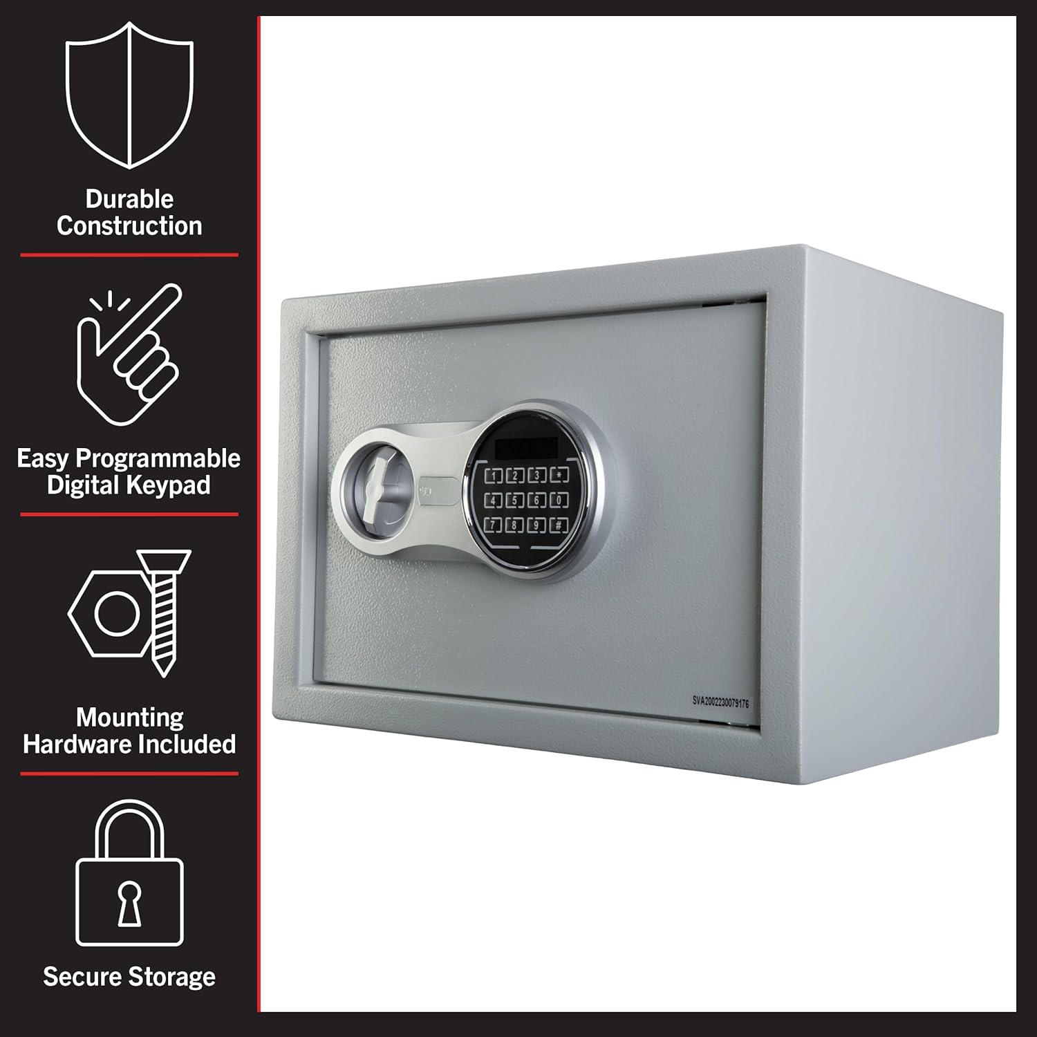 Keep your money, medicine, handguns, jewelry, important documents, and other valuables safe and secure inside this Electronic Digital Safe and Dual Entry Lock Box by Stalwart. Made of thick cold-rolled steel, this office or home safe features a battery-operated keypad that is easily programmed with a 4-digit PIN code and includes two override keys in case of an emergency. The personal safe has an easy-to-use digital display, and the included hardware makes it easy to mount on either a wall or floor. Stalwart, for safekeeping that is Smart, Strong, and Secure. Important: Stalwart is committed to providing the consumer with the absolute best price and value on our entire line of products. Note: This is an exclusive product of Stalwart and ONLY Home Safes & Safe Accessories by Stalwart are guaranteed to be genuine. Avoid buying counterfeit products and transacting with unauthorized sellers.