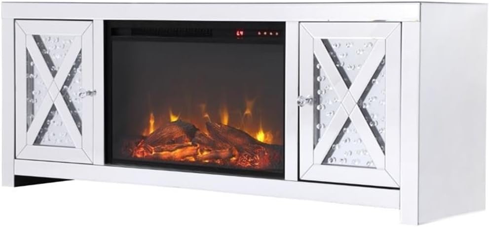 This mirror paneled tv stand is the perfect complement to your entertainment spaces. You can enjoy watching endless movies, host premier nights, or play video games until the stars are sparkling just as bright as the clear crystals that embellish the panels within the X-shaped details of the cabinet doors, which opens to reveal a storage area that is the perfect place to put away board games and various trinkets. Video game consoles and players can find a cozy spot in the middle storage area, or you can place books to read for when the tv is off. The perfect home for your tv, movies, and board games, this stand combines sparkling beauty with function.Features:- Finish: Clear- Material: MDF, Mirror, Metal, and Crystal- Hardware Finish: Clear and Chrome- Hardware Material: Crystal and Metal- Top Shape: Rectangle- Top Material: Mirror- Wood Type: MDF- Shelf Material: MDF- Number of Cabinets: 2- Base Material: MDF- Leg Design: Rectangle- Room of Use: Living Room- Convenient precut 2 inch hole for cable/ wires management- Features shelves for extra storage organization- Stainless steel metal knob- Fully assembled- Top surface is mirrored- Clear crystal inlay- TSCA VI Certification- Clear beveled mirror- Finished back- Removable and adjustable shelvesSpecifications:- Product Dimensions: 23.5" H x 59" W x 16" D- Product Weight: 120.7 lbs- Weight Capacity: (Top) 66 lbs- Shelf Dimensions: 8" H x 12" W x 15" D- Shelf Dimensions: 0.5" Thick- Product Dimensions: (Cabinet) 17.5" H x 12.5" W x 15" D- Product Dimensions: (Door Thickness) 1"- Leg Dimensions: 1.5" H x 2" W x 16" D- Number of Doors: 2- Number of Shelves: 3- Warranty: 1 Year