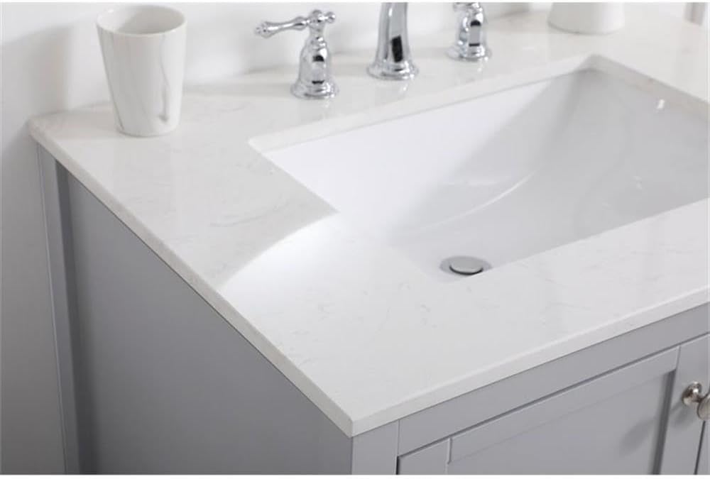 The subtle beauty of the Theo collection 30" vanity in a gray finish exudes comfortable luxury. Its modern, yet traditional beauty will surely dress up your bathroom or powder room without any fuss. The white stone countertop and porcelain undermount sink shows quiet opulence, and the legs support upright without fail. Brushed Nickel hardware complements the trendy gray finish, with pulls adorning the two cabinet doors, showcasing ample storage space within. Slated shelf allows for additional space to organize your towels. Whether this vanity is in your bathroom or for guests, its presence will surely elevate the aesthetics of your room.Features:- Material: Steel, solid wood, MDF, stone, metal, calacatta quartz- Finish: Gray, brushed nickel- Comes with one bottom slated shelf- Convenient access for plumbing installation with cut out back panel- Free standing, no assembly requiredSpecifications:- Product Dimensions: 34"H x 30"W x 22"D- Product Weight: 102.07 lbs- Warranty: 1 year limited- Product Weight: (Table/Desk top) 66 lbs- Product Dimensions: (Countertop) 30"L x 22"W x 0.7"H- Product Weight: (Countertop) 22 lbs- Product Dimensions: (Sink) 8.26"H x 17.13"W x 11.75"D- Product Dimensions: (Sink Drain hole) 1.75"- Product Dimensions: (Faucet hole) 1.38"- Number of Doors: 2- Product Dimensions: (Door Handle) 1"H x 1.1"W x 1.1"L- Cabinet Dimensions: 19.25"H x 26"W x 18.5"D- Leg Dimensions: 33"H x 1.63"W x 1.63"D