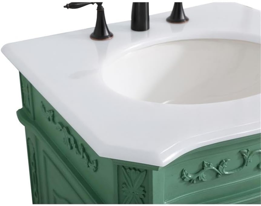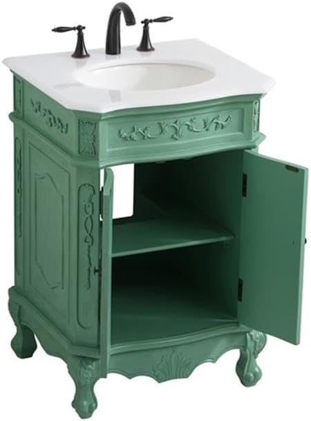 This superb balance of timeless tradition and opulent beauty in a quartz-topped vanity will certainly enhance the aesthetics of any home or office bathroom! Featuring an ivory white durable quartz countertop complimenting the hand painted cabinet with a delicate carved floral design, stands on stylishly carved solid wood French scroll feet. Don't let the design fool you, the quartz countertop and porcelain undermount sink allows for space to get ready, while the antique bronze hardware allows you to discover storage spaces with ease. You and your guests will marvel at this vanity that will both store away your bathroom essentials and enhance the aesthetics of your room.Features:- Material: Aluminum alloy, solid wood, MDF, porcelain, birch, quartz- Finish: Vintage mint green, ivory white- Designed with an Ivory white quartz countertop with ogee edge cut- Comes with an undermount oval porcelain sink- Designed with cabinet doors attached to magnetic latches to secure the door shut- Two doors open to a storage compartment in the cabinet- 8 inch spread predrilled three faucet holes - faucet is not included- Crafted with solid wood legs and engineered wood panels- Built with a removable shelf, perfect to store your bathroom essentials- Room use: Bathroom- Product shape: Rectangle- Hand painted: Yes- Countertop edge style: Ogee- Number of sinks accommodated: 1- Sink mounting type: Undermount- Sink shape: Oval- Vanity mounting type: Free-standing- Soft close doors: Yes- Leg design: Bending legs- Any certification: Yes- Faucet holes: 3- Number of cabinets: 1Specifications:- Product Dimensions: 36"H x 21"W x 24"D- Product Weight: 86 lbs- Product Dimensions: (Countertop) 0.75"H x 21"W x 24"L- Product Weight: (Countertop) 23 lbs- Product Dimensions: (Sink) 7"H x 16"W x 13"D; (Sink drain hole size) 1.75; (Sink drain distance from side edge of countertop) 12- Product Weight: (Sink) 12 lbs- Product Dimensions: (Door handle) 0.79"H x 0.91"W x 5.43"L; (Door thickness) 0.5- Product Dimensions: (Faucet hole size) 1.38; (faucet hole spacing) 8"3; (Faucet hole distance to top edge of countertop) 8; (faucet hole distance to side edge of countertop) 2.5- Product Dimensions: (Cabinet interior) 19.75"H x 16.75"W x 17"D- Product Dimensions: (Distance between shelf and cabinet/sink) 0.5- Shelf Dimensions: 16.75"W x 16"D; (thickness) 11.25"- Leg Dimensions: 7.5"H x 3"W x 3"D- Number of Doors: 2- Number of Shelves: 1- Weight Capacity: 24 lbs- Warranty: 1 year