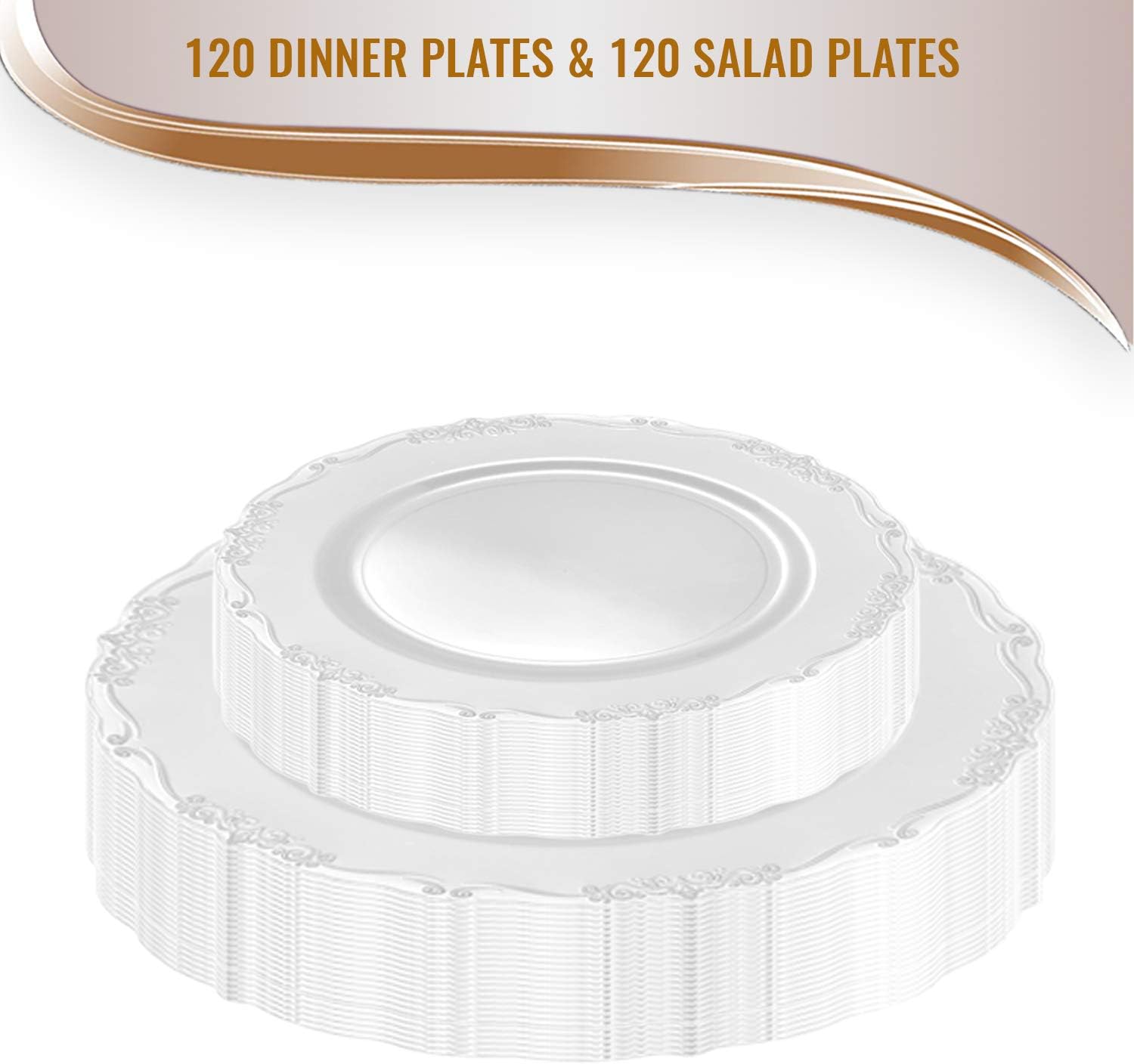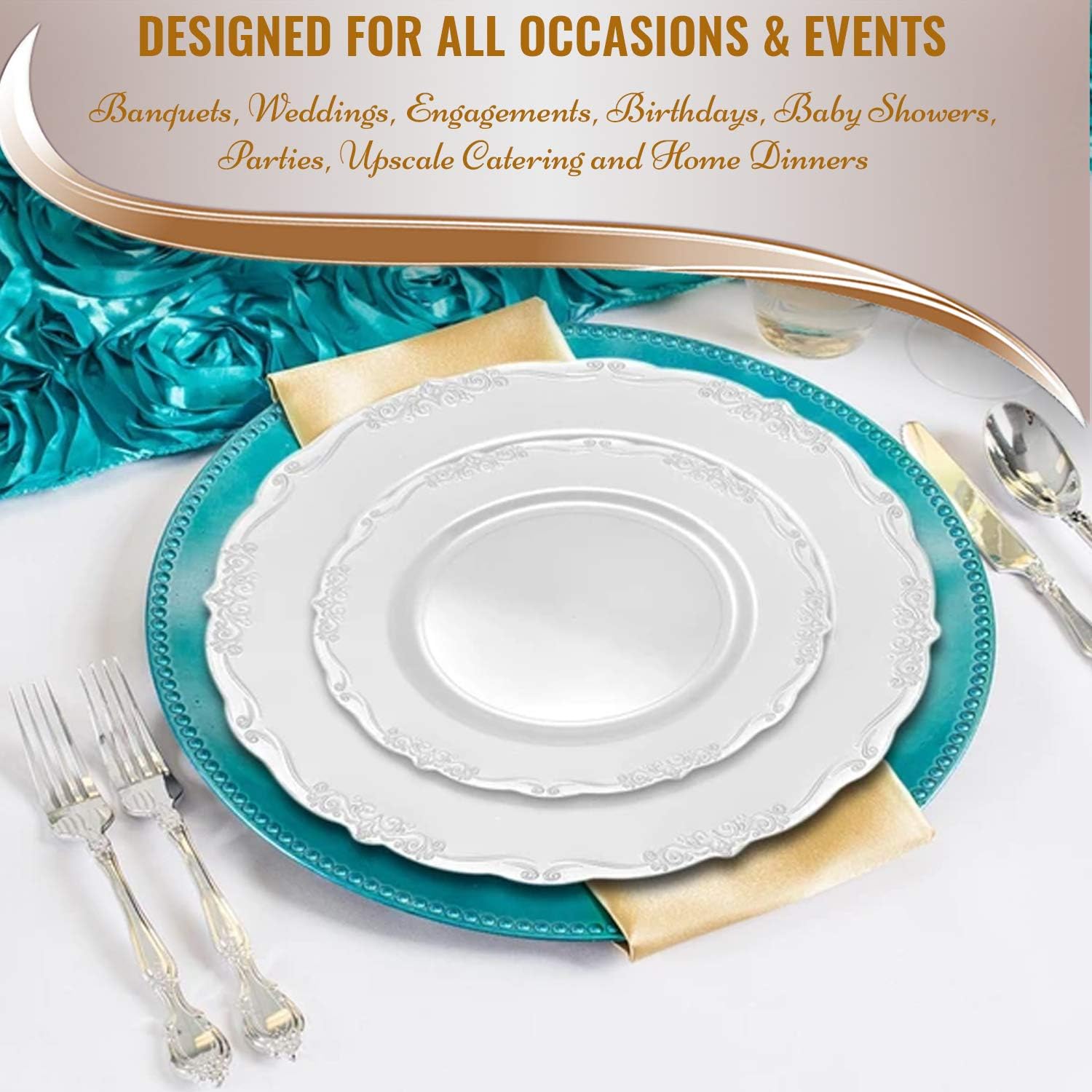 Made with high quality strong durable plastic Disposable Upscale elegant look Great substitute for china Saves time and effort for easy clean up, just throw them away after Uses: Family gatherings Holiday parties Events Bridal showers Baby showers Birthdays Anniversaries Weddings & more Whether you're using these party plates for family gatherings, parties, or any special occasion, the right quality plastic dinner plates can make all the difference when it comes to impressing your guests. That’s why we put together this gorgeous elegant plastic plates set.