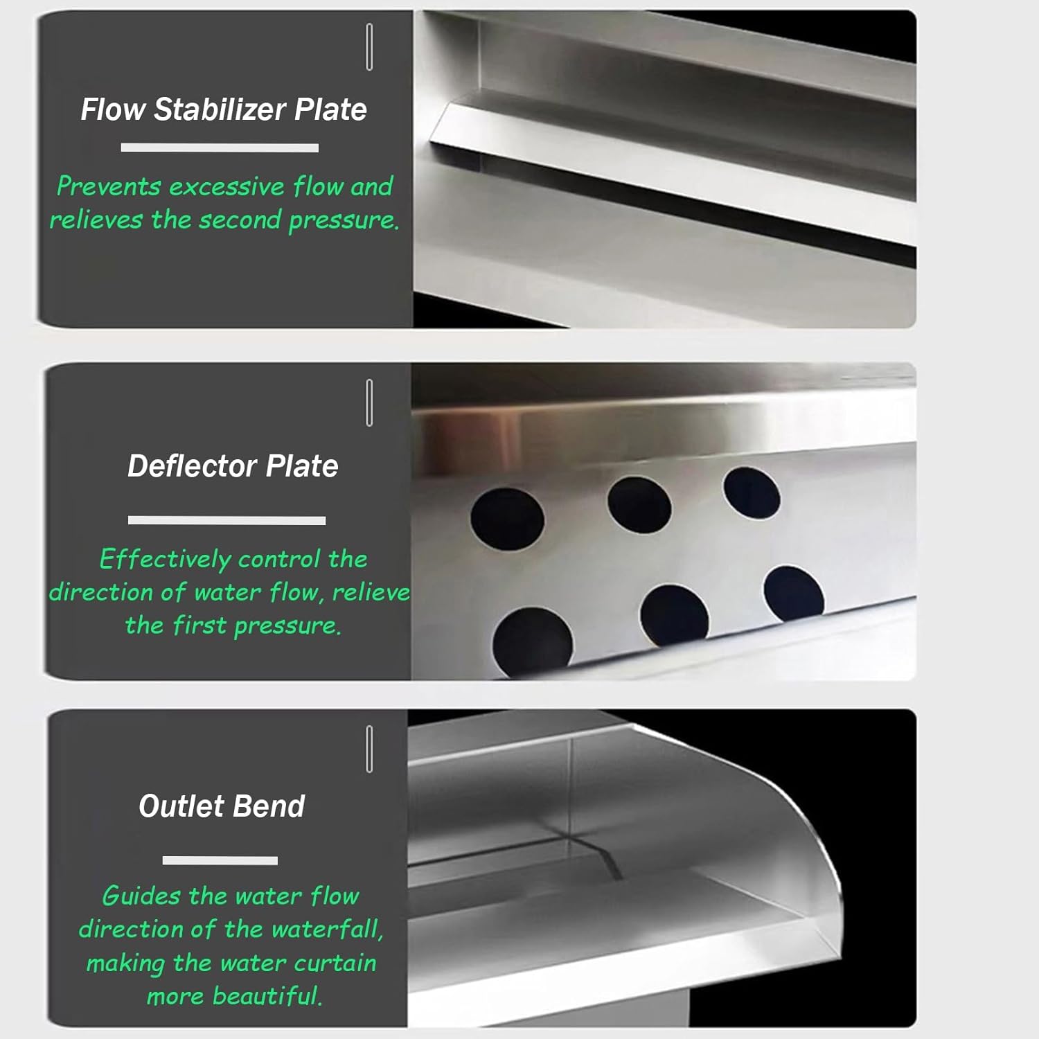 Elevate your water feature with our high-quality Waterfall Spillway, designed to enhance both indoor and outdoor spaces. This versatile addition seamlessly integrates into various applications, including ponds, pools, and garden waterfalls, making it an essential choice for any landscape design. **Customizable Length**: Tailor the spillway to suit your specific project needs, allowing for a perfect fit in any setting. **Durable Construction**: Made from premium 304 stainless steel, our spillway is resistant to rust and weather conditions, ensuring it maintains its beauty and functionality over time. **Multiple Color Options**: Available in a range of colors, you can easily coordinate it with your existing décor, enhancing the aesthetics of serene ponds, sparkling pools, or modern gardens. **Versatile Applications**: Whether you're creating a tranquil pond, a stunning pool feature, or a contemporary waterfall, this spillway meets diverse design requirements. **Specifications**: - **Material**: 304 Stainless Steel - **Color**: Stainless Steel White - **Inlet Styles**: Lower Inlet, Rear Inlet, Left Inlet, Right Inlet - **Spout Styles**: Arc Spout, Duckbill Spout, Curtain Spout, Water Curtain Spout, Brushed Spout - **Spillway Length**: Customizable - **Spillway Width**: 15 cm (5.9 in) - **Spillway Height**: 20 cm (7.8 in) - **Water Inlet Diameter**: 3.2 cm (1.2 in) - **Mounting Height**: 1.2 m (47.2 in) **Package Includes**: - 1 × Waterfall Spillway - 1 × Connector **Notice**: Please allow for a 1-3 cm error due to manual measurement. Color may vary slightly due to lighting and display differences. For accurate representation, refer to the actual product. *Note: Water pump sold separately.* Transform your water feature today with our elegantly designed Waterfall Spillway, and enjoy the tranquil ambiance it brings!