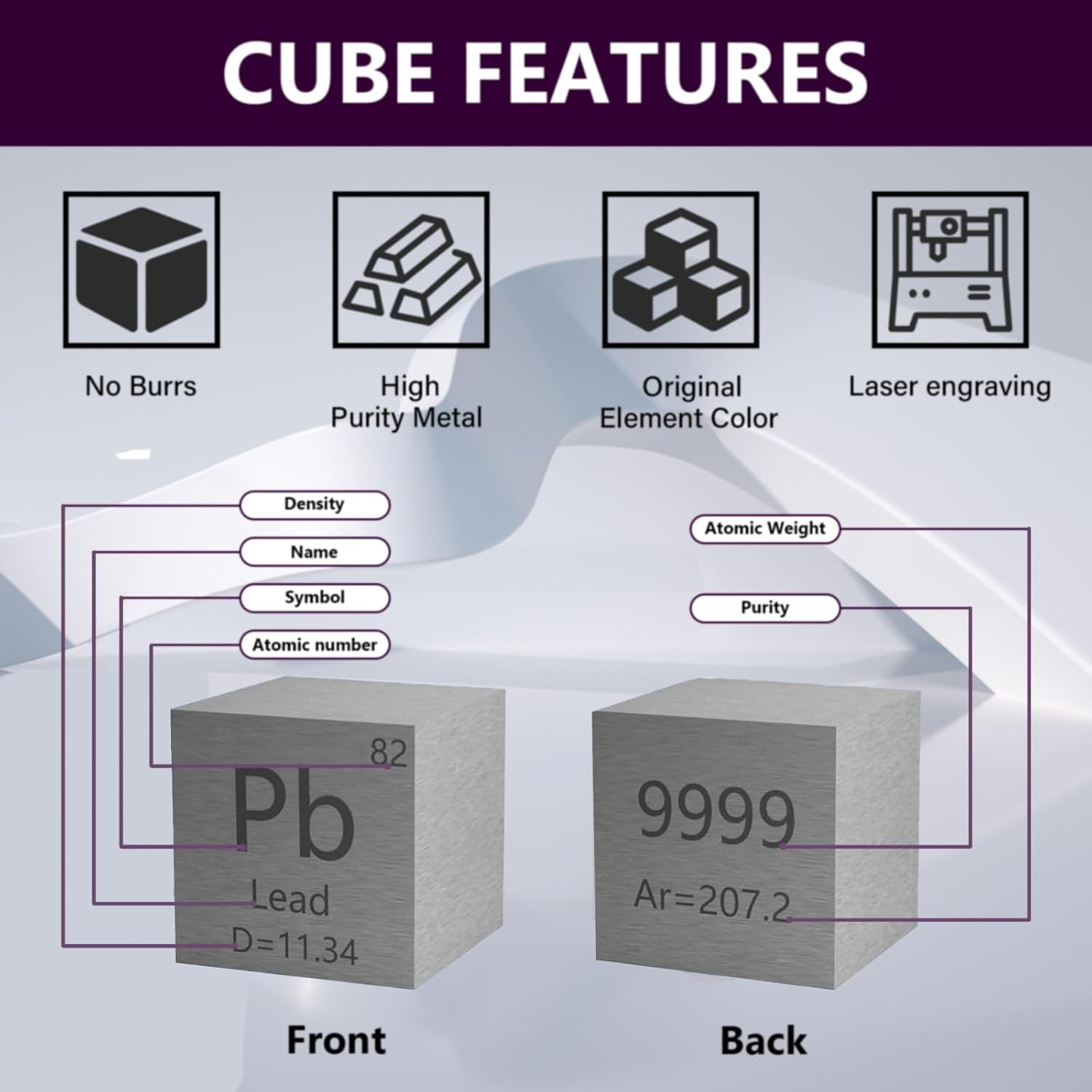 Friendly reminder: Due to the elemental metals, there will be different degrees of oxidation and darkening, so try to keep the cube dry. Reduce direct contact with your hands, sweat will accelerate the oxidation of the cube. Product Specifications: Color: The original element color Material: 99.99% pure metal Size:10MMx10MMX10MM Surface: Laser engraved information including element symbol, name, density, purity and atomic weight etc.