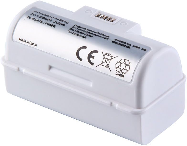 1.This Li-ion rechargeable battery with a practical price has High Capacity . 2.The battery can be taken off and will be fully charged in 2 hours. 3.Easy to charge and connect Note: If you don't use the battery for long time, please recharge it every three months to prolong the battery lifetime. This replacement Lithium Ion Battery is compatible with the Braava jet 240 very well, with an additional battery that can keep your Braava jet to clean a second room without waiting for a recharge. Type: LI-ION Battery Voltage: 3.6VCapacity: 5300mAh Color: White Discharging time: 70-100min Weight: 0.26 lb / 0.12KG Dimension: 2.95*1.65*1.3 inches / 7.5*4.2*3.3 cm Compatible Models: For Irobot Bravva Jet 240, Model NO.4446040 Can be taken off, Charges in approximately 2 hours If you don't use the battery for long time, please recharge it every three months to prolong the battery lifetime Package include: 1XBattery for iRobot Braava Jet 240