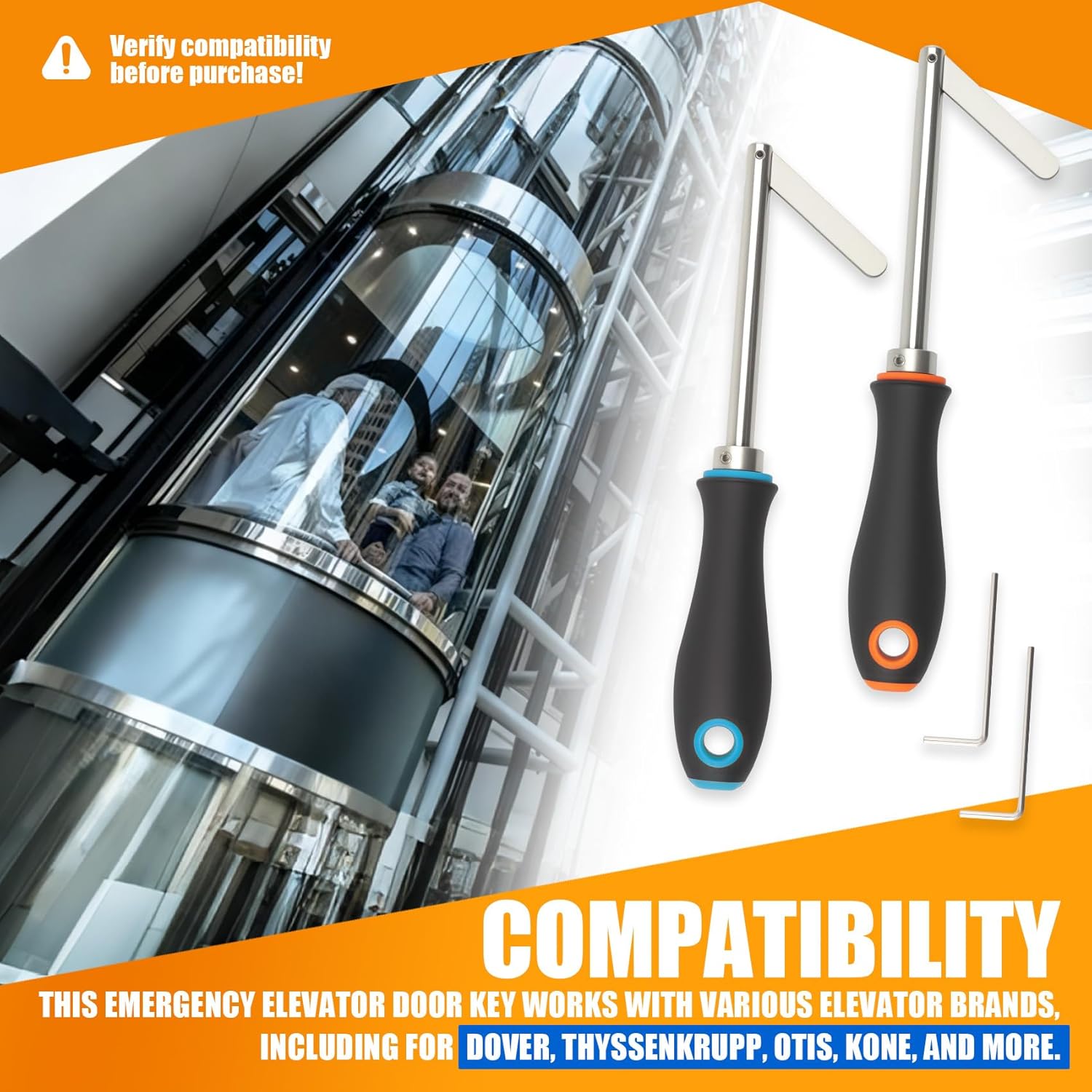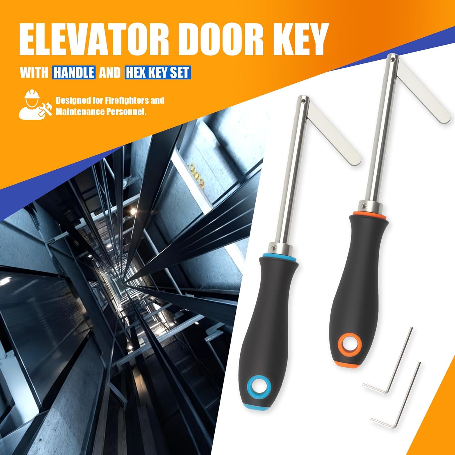 Elevator Descent Key & Door Key Set - The Professional Choice for Emergency Rescue and Elevator Maintenance 🛠️ Product Overview This set is specifically designed for elevator technicians, emergency responders, and professional maintenance teams. It includes 2 elevator door keys (red + blue) and 2 hex keys, meeting your needs for efficient and safe operation during daily work and emergencies. Crafted from premium steel with a robust, durable construction, it serves as a reliable tool for addressing elevator malfunctions, power outages, or emergency door openings. 📦 Product Specifications (Hand-measured, minor variations possible) · Overall Dimensions: Total length 10.7 inches, ergonomically designed with ample operating torque. · Lock Leg Design: Steel locking leg measures 2.5 inches long, compatible with most standard elevator lock slots. · Ergonomic Handle: 1.26-inch width ensures comfortable, stable grip with minimal effort. · Included Accessories: 1.81-inch long, 0.68-inch wide hex wrench adjusts key insertion depth for various elevator models. · Portable Design: Each key features a hanging hole for easy carrying and organization. ✅ Wide Compatibility This key works with most major elevator brands, including but not limited to: · Common elevator systems from Dover, Thyssenkrupp, OTIS, KONE, etc. · Features a standard 3/8-inch steel shaft interface and 1/8 x 3/8-inch steel locking leg for broad versatility. Professional Tools, Reliable Protection| Meticulously designed and manufactured by YRZHKS, this product is dedicated to providing efficient, dependable tool solutions for elevator industry professionals. We understand the critical importance of every second in emergency rescue and the essential need for tool stability during routine maintenance. Choosing our products means choosing professionalism and peace of mind.