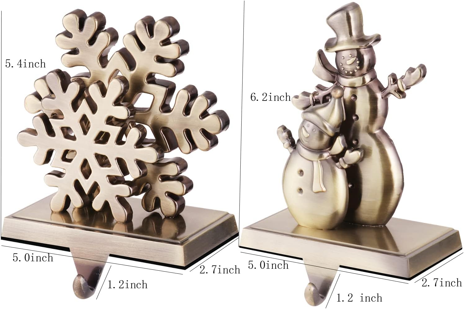 Each Chistmas stocking hanger is nickel-plated,so there's no need to keep polishing. Stays classic from year to year with a perfectly elegant holiday theme. The sturdy stocking holders for fireplace mantle have a 5-pound capacity, and it does not require adhesives to keep the stocking holder in place. It’s enough to hold a lot of stuff on your favorite christmas stockings bulk on them and last long. Christmas stocking holder specifications Reindeer stocking holder : 5 inch(L) x 2.7inch(W)x 6.3inch(H) Snowflake stocking holder: 5inch(L) x 2.7inch(W)x 4.8 inch(H) Tree stocking holder: 5 inch(L) x 2.7 inch(W)x 6.4 inch(H) Snowman stocking holder: 5.0inch(L) x 2.7inch(W)x 6.2 inch(H) Material: Zinc alloy and Aluminium Alloy Color: Bronze Weight capacity: 5 pounds Features: Sturdy and durable, the holders simply use their own weight to suspend stockings, whether empty or full of stuffers. Weighted Stocking Holders for Mantle Christmas stocking hangers for mantel is suitable for Mantles, fireplace, Bookshelves, Staircases, etc. Each stocking holder has a velvet bottom, can well protect your furniture and can prevent it from sliding over a hard surface, so you can fill your Christmas stockings with many presents. Holds the gift of Christmas stockings while adding a decorative holiday touch to any room and creating fond memories.