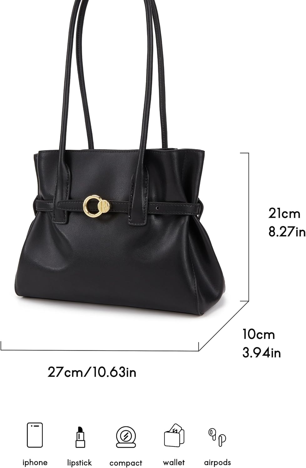 ELLEShoulder Bags for Women, Leather Top Handle HandbagsPRODUCT DETAILS-Split leather-Fabric lining-Open top with magnetic closure-Internal slip and zip pocket-Gold-toned metal hardware-Dual top handles-Come with dust bagSIZE & FITProduct measurements:- Width: 10.63in / 27cm- Height: 8.27in /21cm- Depth: 3.94in / 10cm- Strap Length: 22.83in / 58cmFits: iPhone Pro Max/Plus, Power bank, Airpods, Wallet, and lipstick.●ELLE Bags are made with carefully selected materials. Please handle with care for longer product life.