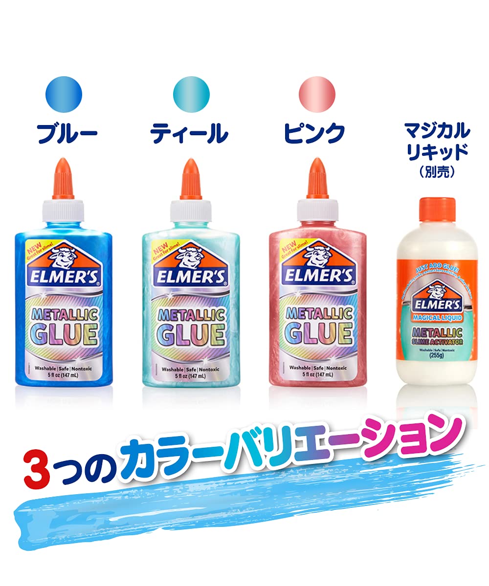 ●ピカピカのメタリック調液体のり ●ELMER'S マジカルリキッドを使うと簡単にメタリック調のスライムが作れます。(ELMER'S スライム作りにご使用の場合:対象年齢 6歳以上) ●キャップ先端がペン型のため、小さな場所にも塗りやすいデザイン ●アメリカの安全規格に適合したAPマーク認定