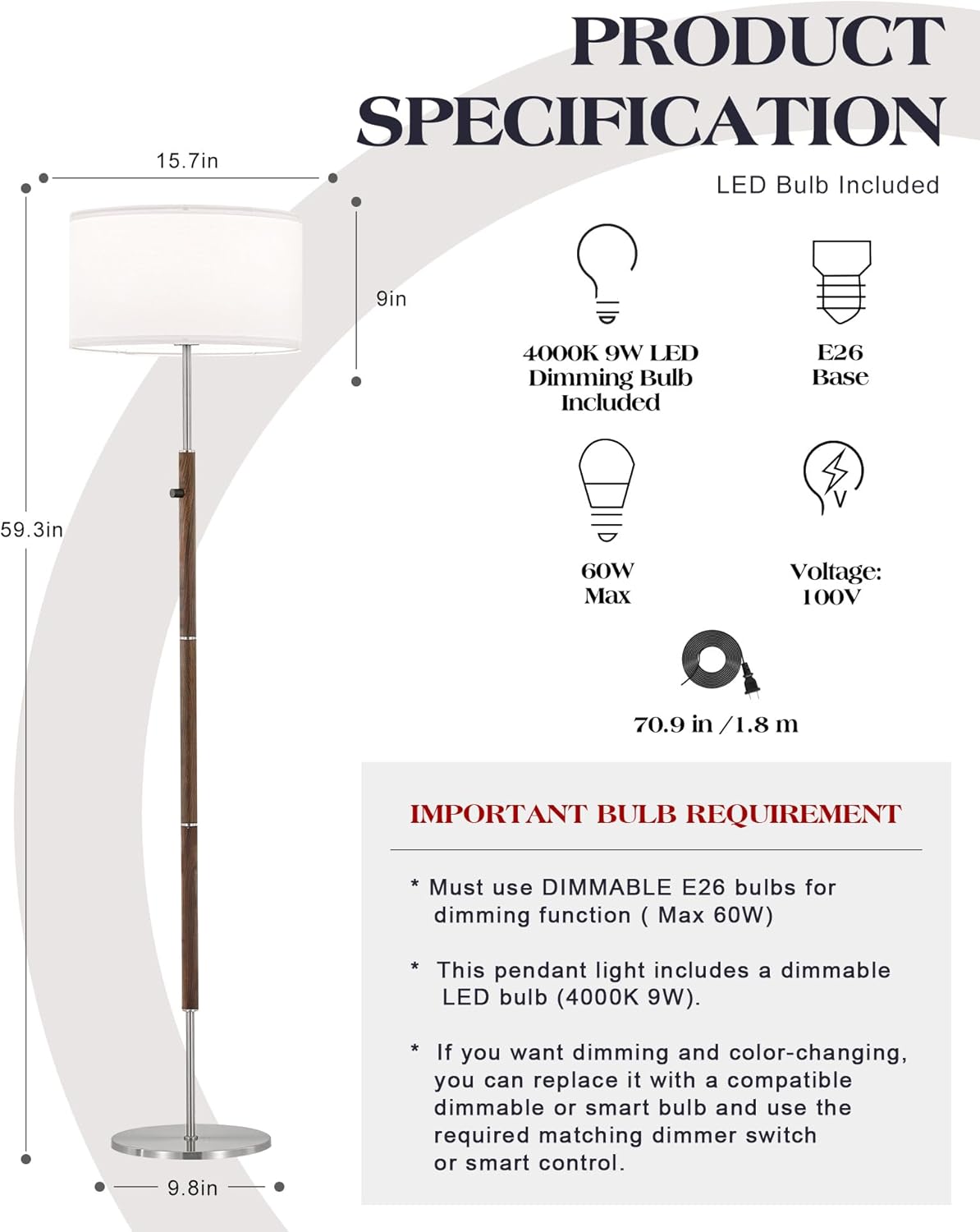 • 【Brightness Stepless Dimming & Rotary Knob Switch】 Equipped with a user-friendly rotary switch on the pole for seamless, stepless dimming. This allow you to adjust the brightness levels to suit your mood perfectly. Includes a 9W 4000K dimmable LED bulb that provides a crisp, neutral glow.( Note: This fixture supports up to a 60W E26 dimmable bulb and is specifically designed to work only with dimmable bulbs.Compatible with smart light bulbs and remote controls)