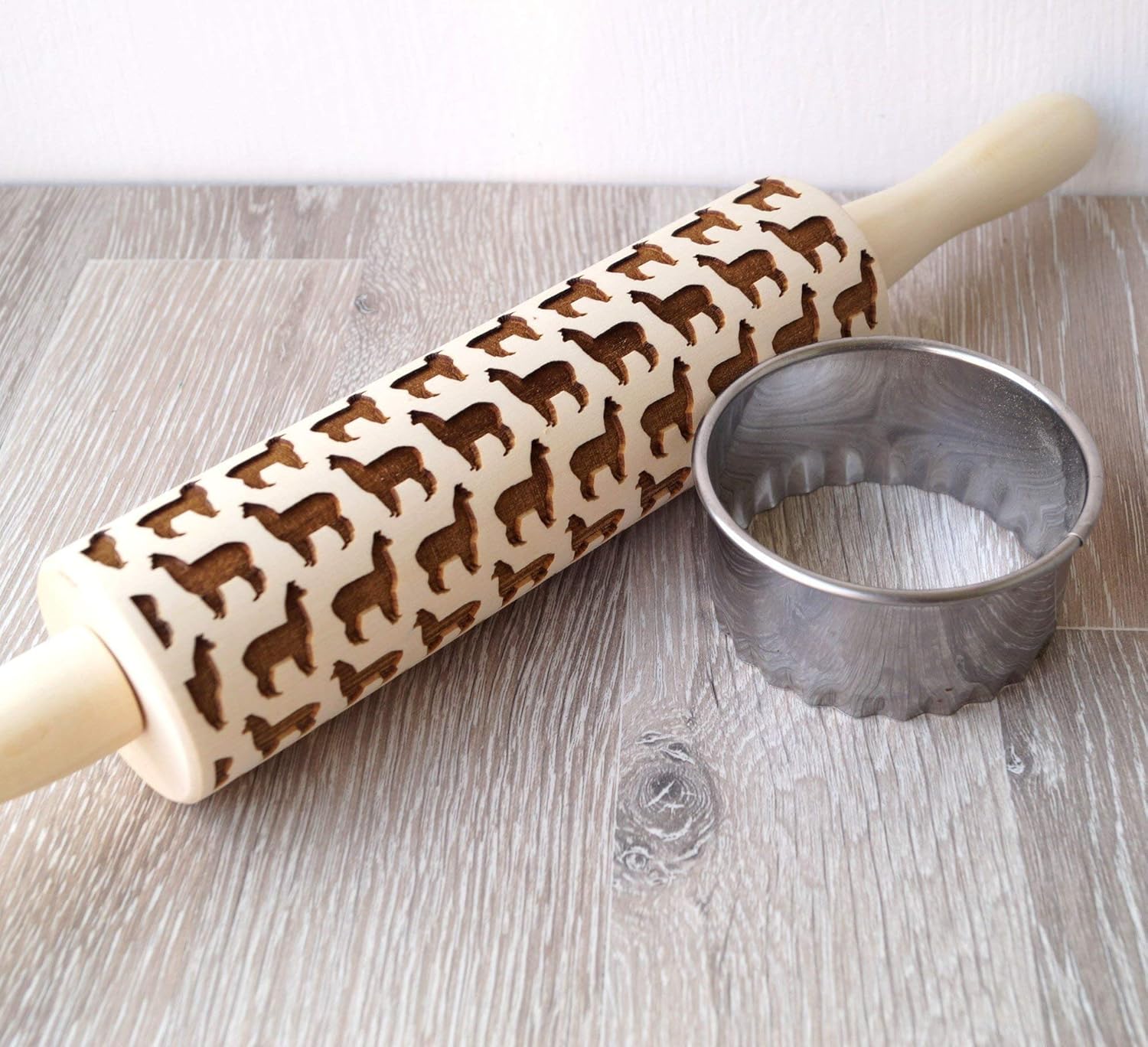 Wooden embossing rolling pin Alpaca pattern. The rolling pin measures 2'' in diameter and it is 13,5'' long including the handles (6,5'' without the handles). The rolling pin has to be cleaned dry with a brush, then washed with cold water and dryed before next using. Make sure to oil it a bit before rolling it on the dough which has to be sprinkled with flour for perfect imprint.