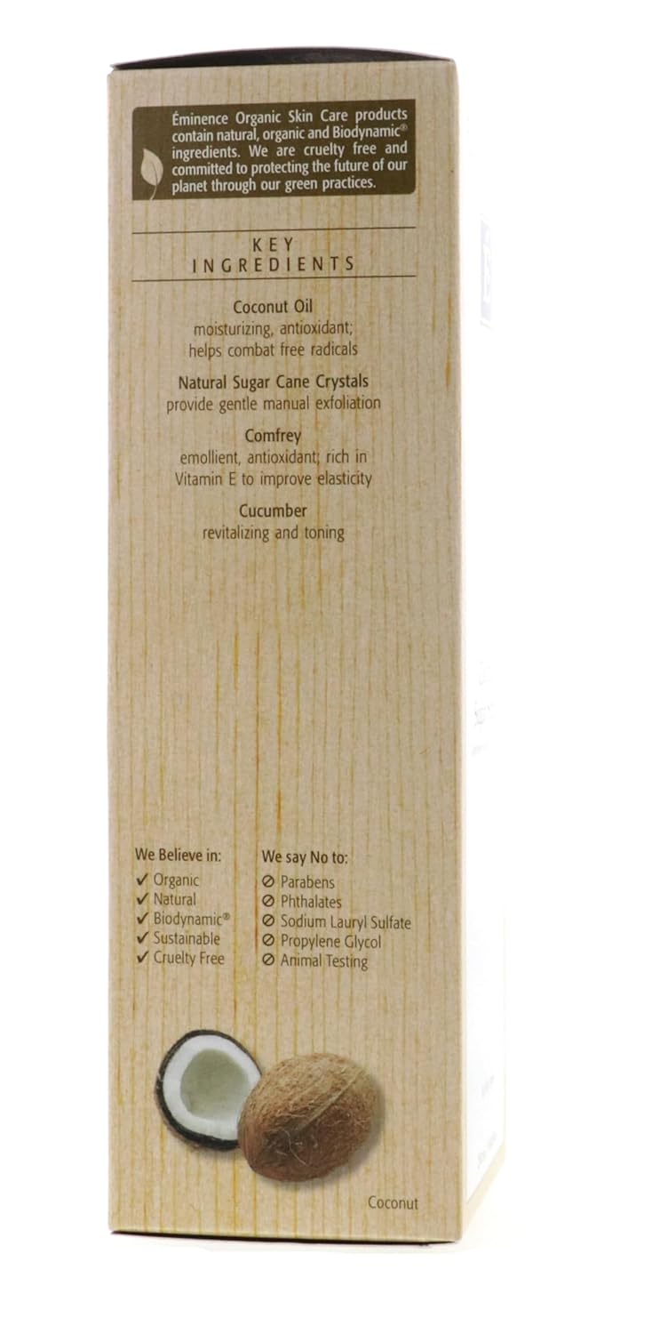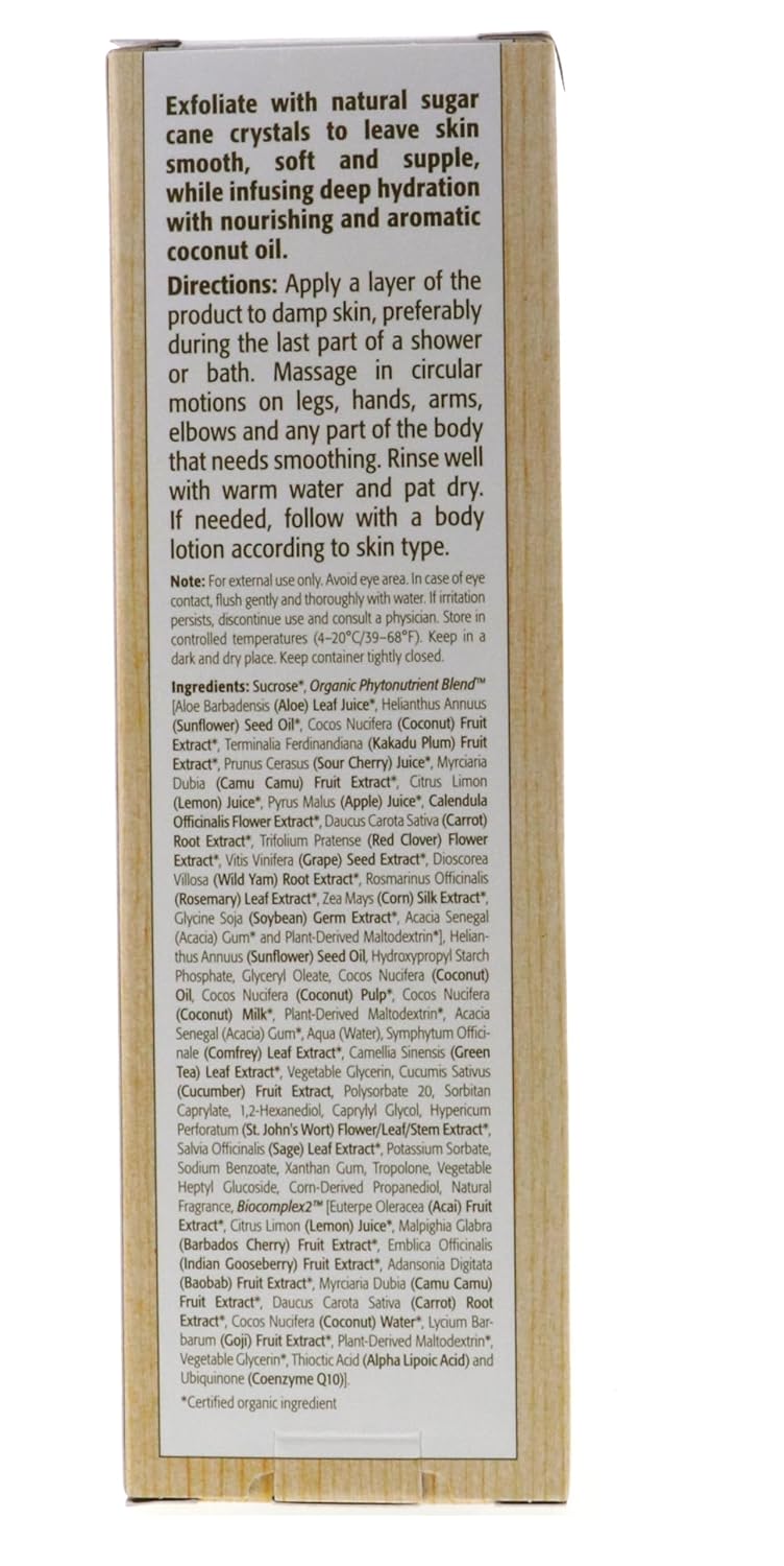 An antioxidant-rich moisturizing body scrub Contains Virgin Coconut Oil to hydrate skin & prevent damage caused by drying Blended with Raw Sugar Cane Granules comprising natural Alpha Hydroxy Acid for natural exfoliation Loaded with Comfrey to