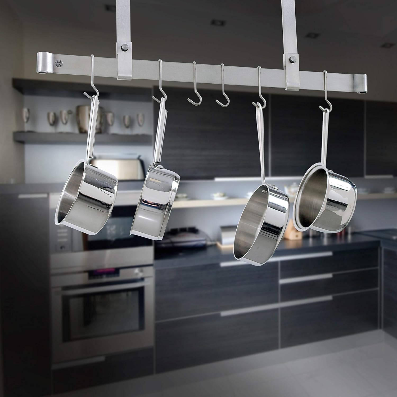 A simple and stylish solution for narrow spaces. Sliding hanging straps make this rack easy to install just about anywhere. Includes two 4-inch C-rings and 6 angled pot hooks. Utensils, extension hooks and pots are not included.