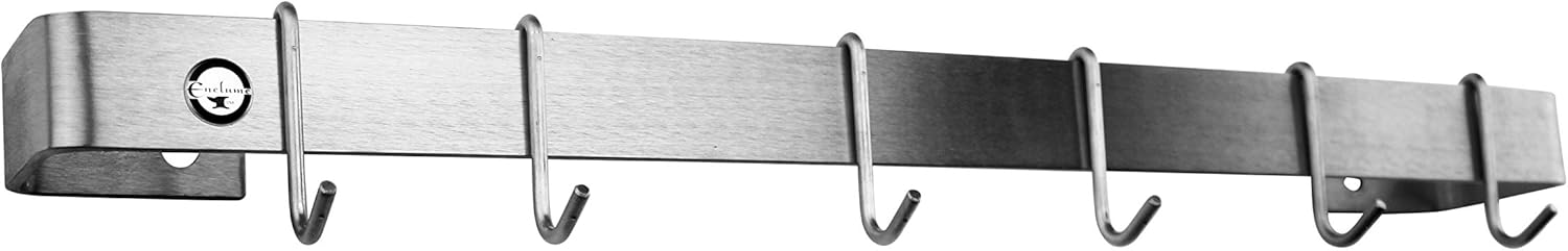 Handcrafted in the USA, this Enclume Classic 30" Solid 304 Stainless Steel Wall Rack Utensil Bar will help get your cookware, utensils, pots, pans, towels or tools out of the drawer and up on the wall where you can access them easily. Organize and improve the function in your kitchen, near your BBQ to hang your tools or anywhere in your home. A great solution for small spaces and urban living. Each piece is forged from Solid Stainless Steel using traditional French metal working techniques. This unique design ensures that no mounting hardware is visible providing a elegant, clean look. The Brushed 304 Stainless Steel is beautiful and authentic, not powder coated, painted or plated. Includes 6 Straight Multi-Purpose Hooks. Hardware and instructions for recommended installation are included. Mounting directly into studs is recommended. Consult your handyman or local hardware store for mounting to your specific wall type. For custom sizes or if you have any questions, contact Enclume Design Products directly.