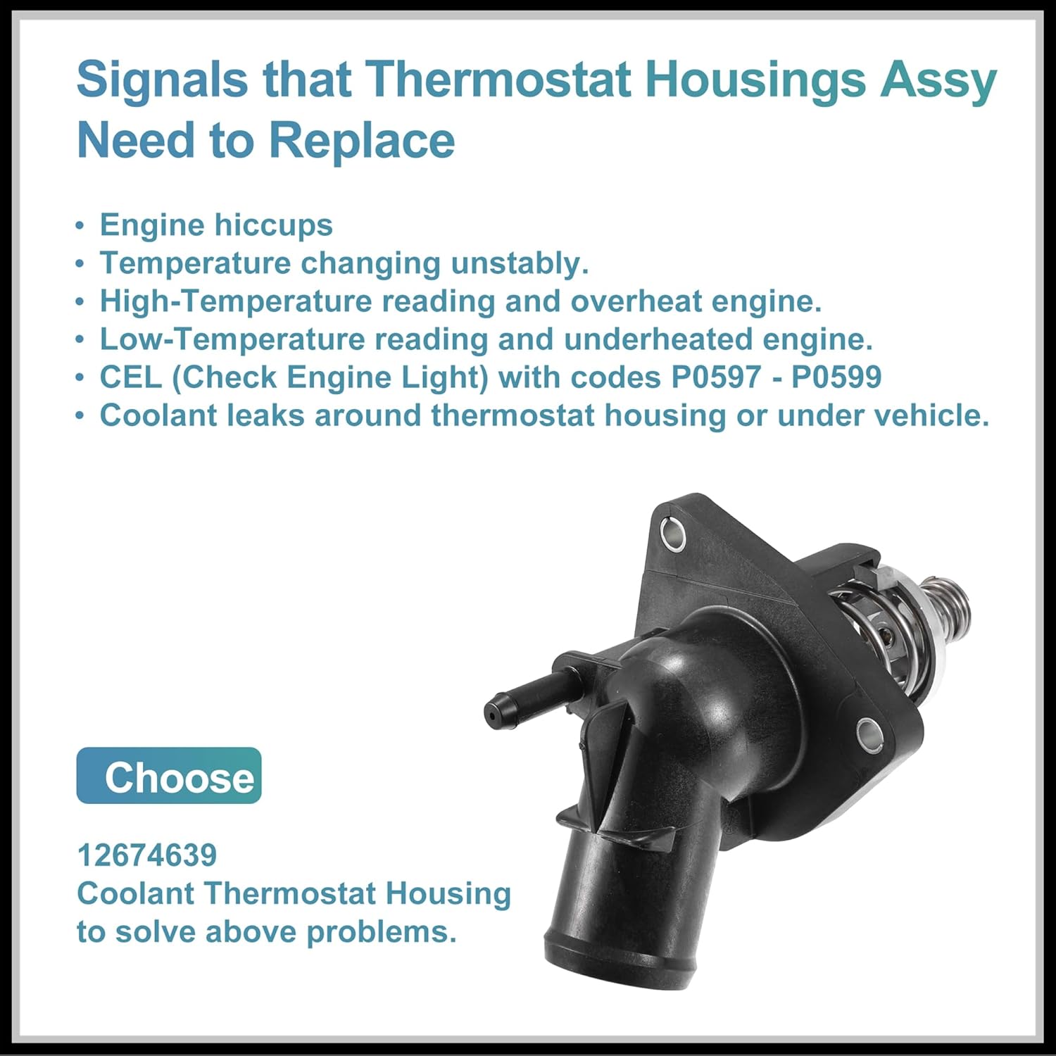 Suitable for:for Cadillac Escalade Base, Luxury, Platinum, 6.2L V8 - Flex, 6.2L V8 - Gas 2015-2020for Cadillac Escalade ESV Base, Luxury, Platinum, 6.2L V8 - Flex, 6.2L V8 - Gas 2015-2020for Chevrolet Corvette Stingray 6.2L V8 - Gas 2014for Chevrolet Silverado 1500 5.3L V8 - Flex, 5.3L V8 - Gas, 6.2L V8 - Gas 2014-2019for Chevrolet Suburban LS, LT 5.3L V8 - Flex 2015-2020for Chevrolet Tahoe LS, LT 5.3L V8 - Flex 2015-2020for GMC Sierra 1500 Base, Denali, SLE, SLT 4.3L V6 - Flex, 5.3L V8 - Flex, 6.2L V8 - Gas 2014-2019for GMC Yukon Denali, SLE, SLT 5.3L V8 - Flex, 6.2L V8 - Flex 2015-2020for GMC Yukon XL Denali, SLE, SLT 5.3L V8 - Flex, 6.2L V8 - Flex 2015-2020Product Description:Automatically adjust the water yield flowing into the radiator according to the temperature of the cooling water, so as to ensure that the engine works within the appropriate temperature range.This is a non-OEM product, accessory only!Product Specification:Material: Plastic, MetalColor: Black, Silver ToneOE Number: 12674639Size: 13x9.2x3.4cm / 5.12"x3.62"x1.34"(L*W*H)Mounting Hole Diameter: 6.5mm / 0.26"Note:Please check your Car Model or OE Number, reference our product before purchase Before!Packing List:1 x Thermostat Housing Assembly