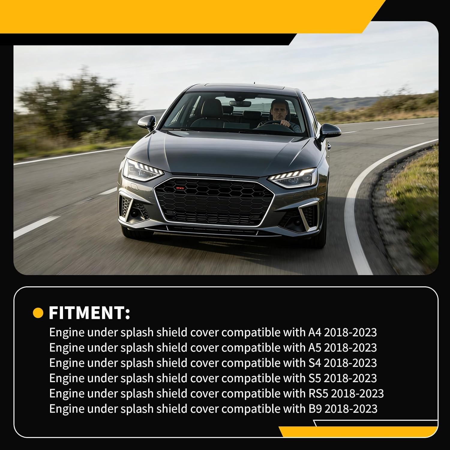 Fitment - Engine under splash shield cover compatible with A4 2018-2023 Engine under splash shield cover compatible with A5 2018-2023 Engine under splash shield cover compatible with S4 2018-2023 Engine under splash shield cover compatible with S5 2018-2023 Engine under splash shield cover compatible with RS5 2018-2023 Engine under splash shield cover compatible with B9 2018-2023 Specifications - Interchange Part Number: 8W0863822B, 8W0-863-822-B, 8W0-863-822-A, 8W0863822A Location: Rear Type: Splash shield guard Install: Easy installation Included Components - 1 X Splash shield guard