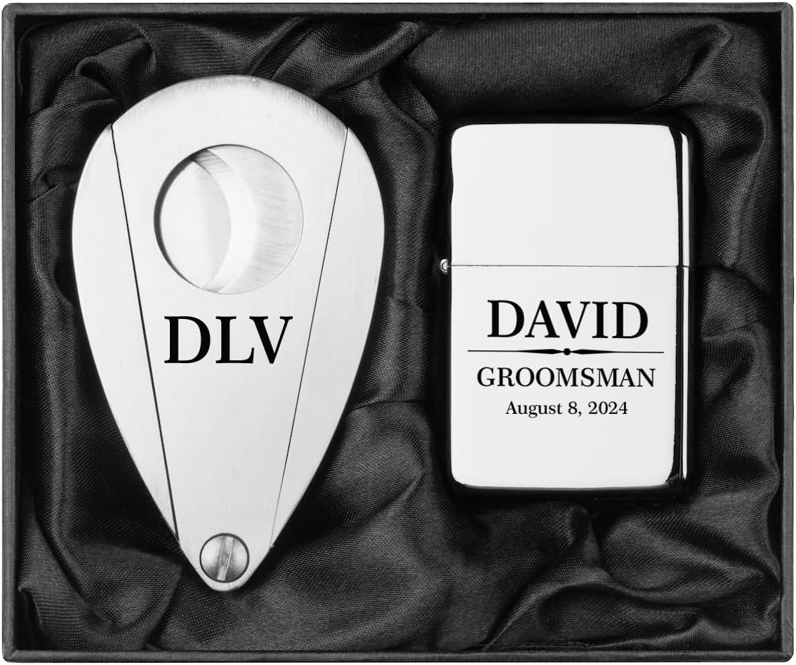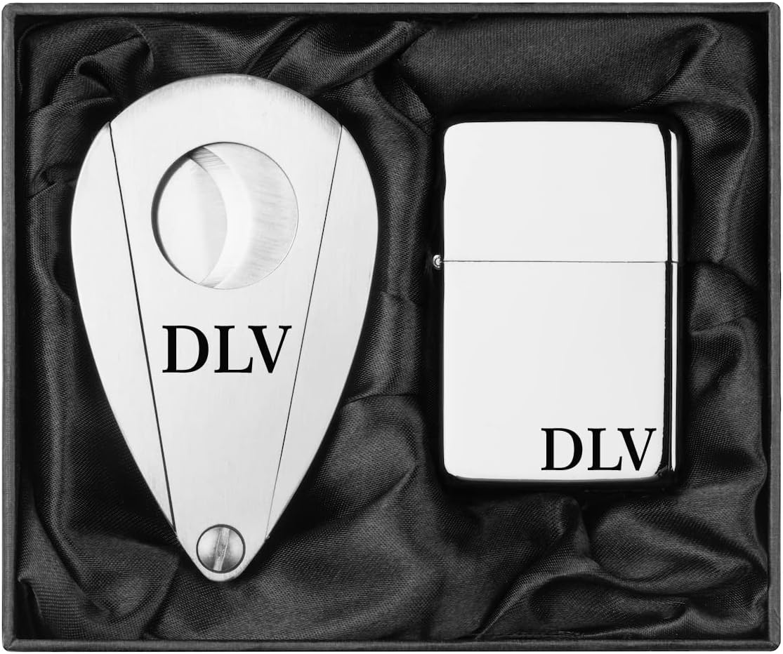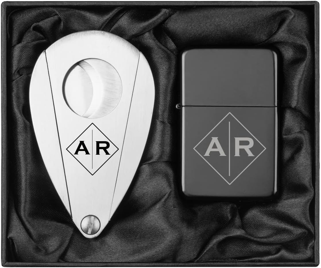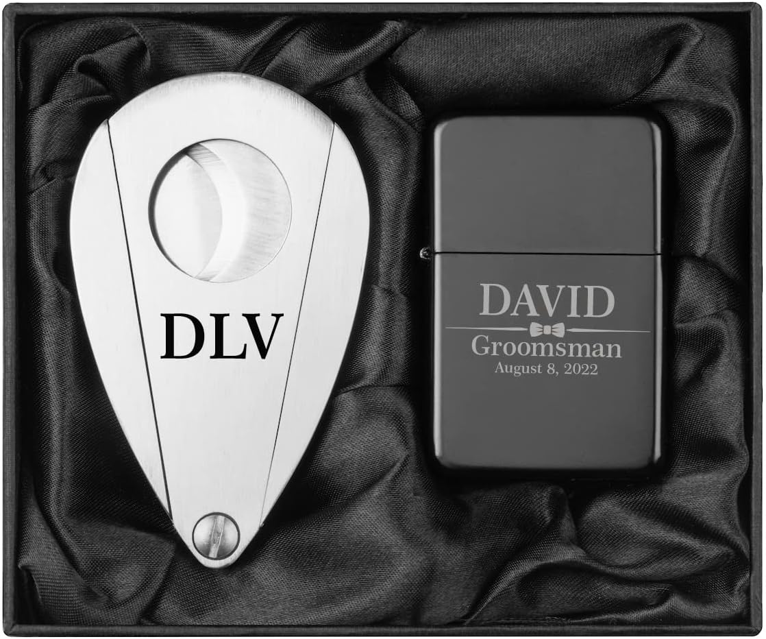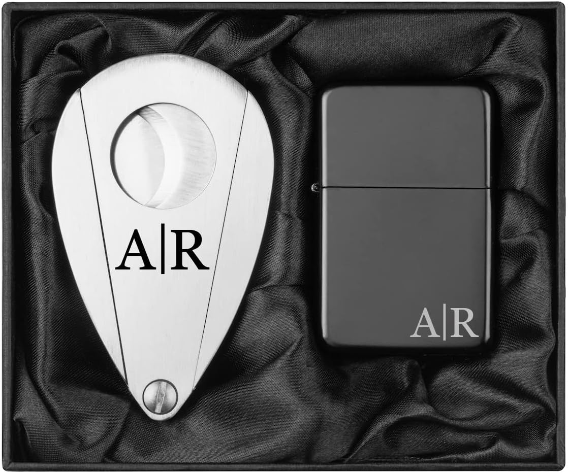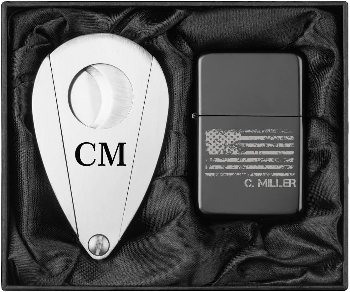 Engraved Stainless Steel Cigar Cutter & Matte Black Lighter Personalized Custom