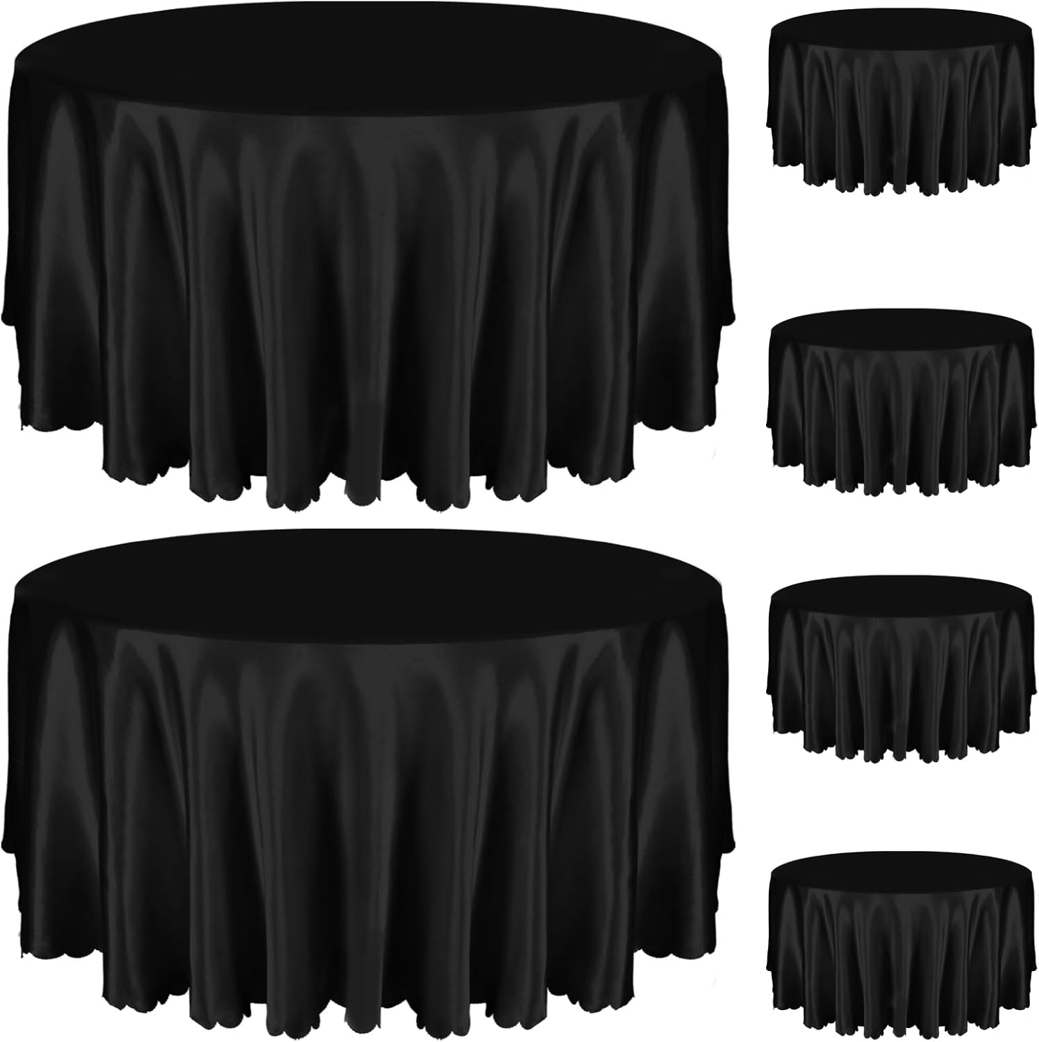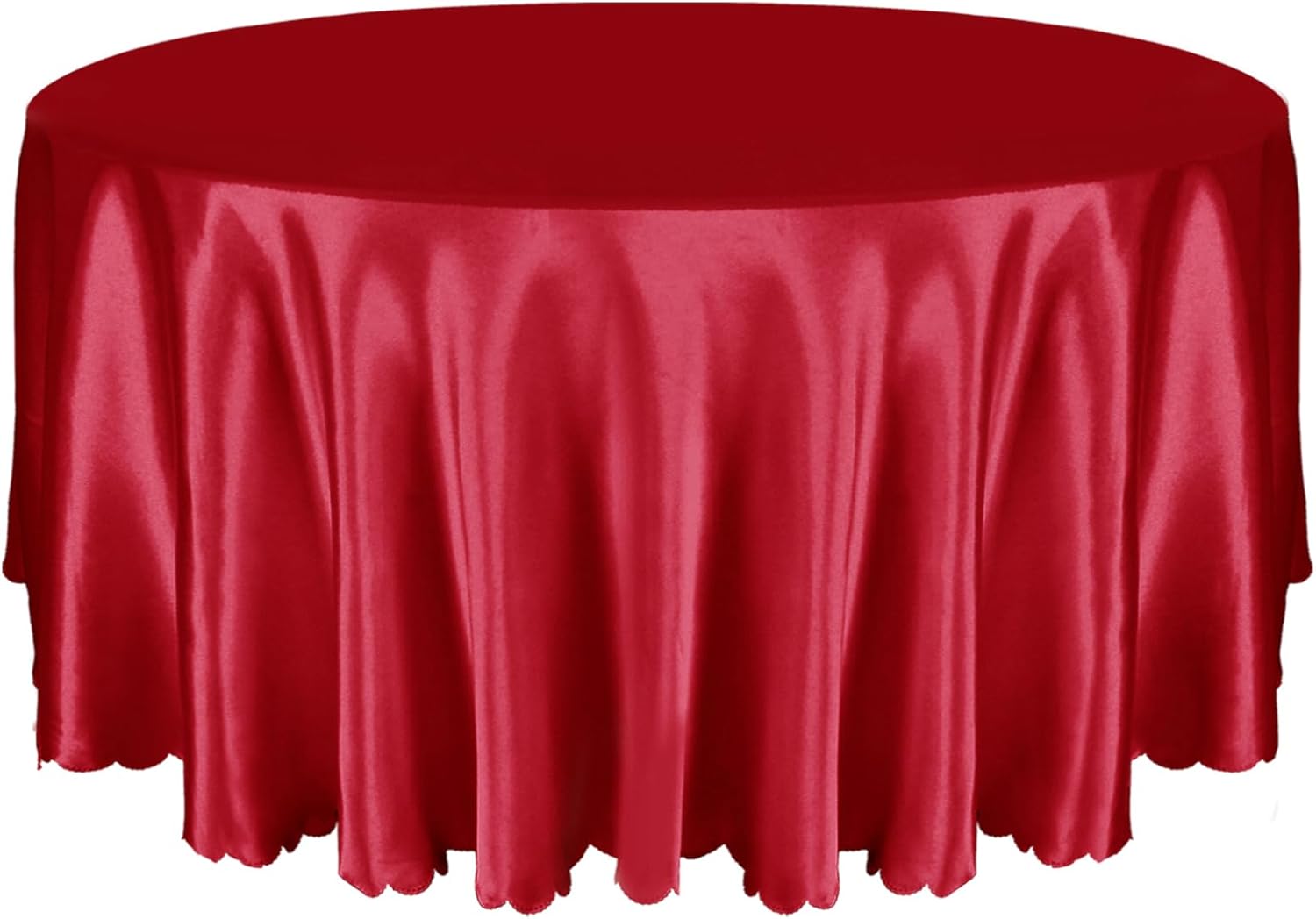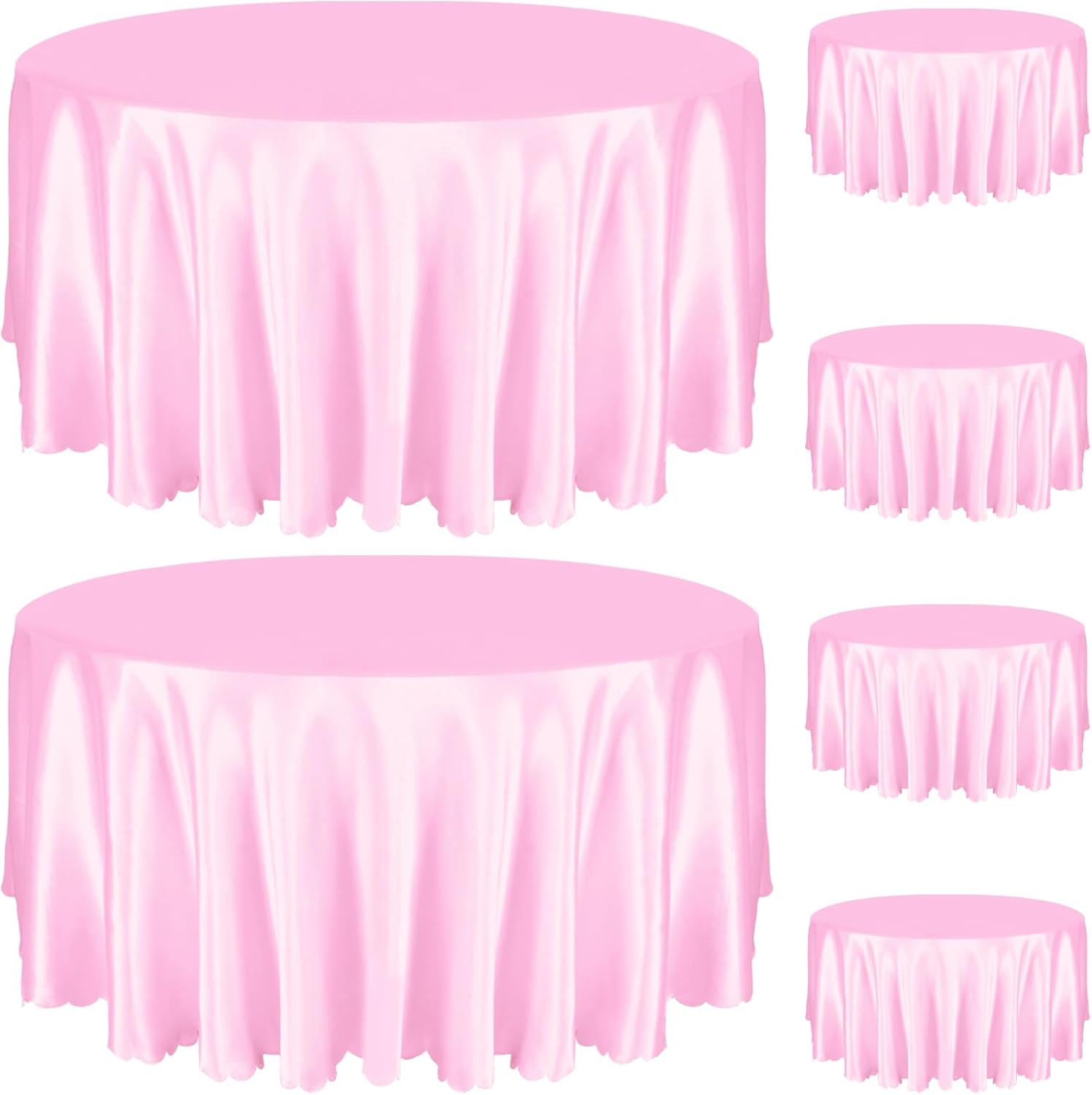Round Satin Table Cloth: Premium Satin Tablecloths are made from 100 percent polyester and feature a luxurious texture, stunning sheen and elegant drape. Its wrinkle-resistant design and one-piece production process ensures a polished look for many special occasions. Measuring 108 inches in diameter, this tablecloth fits tables from 60 to 90 inches, with hem lengths of 15-30 inches at different table sizes. You can choose the right size for a variety of different events such as weddings, birthdays, or everyday meals to achieve the best decor. Maintenance is effortless, as the silky fabric retains its shine after multiple washes. Simply avoid bleach and prolonged exposure to the sun, and wash in cold water as much as possible to keep your tablecloths looking great for a long time. Specification: Material: 100 Percent Polyester (Satin Fabric) Color: Red Quantity: 6 Pack Diameter: 120 inch / 10ft Drop lengths on different sized tables: 30-inch diameter round table: 45 inch drop 36-inch diameter round table: 42 inch drop 48-inch diameter round table: 36 inch drop 60-inch diameter round table: 30 inch drop 72-inch diameter round table: 24 inch drop 90-inch diameter round table: 15 inch drop For other diameters you can try to estimate the hem length according to the following formula: Tablecloth Diameter = Table Diameter + Drop Length * 2 Note: Light shooting and different monitors may cause the items in the pictures to be slightly different in color from the real thing. Goods received may be slightly wrinkled due to packaging, use an iron to gently iron to return to its original state. Please allow about 0.5 inch error due to manual measurement.