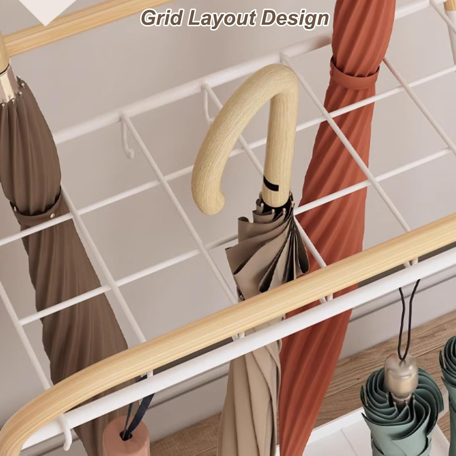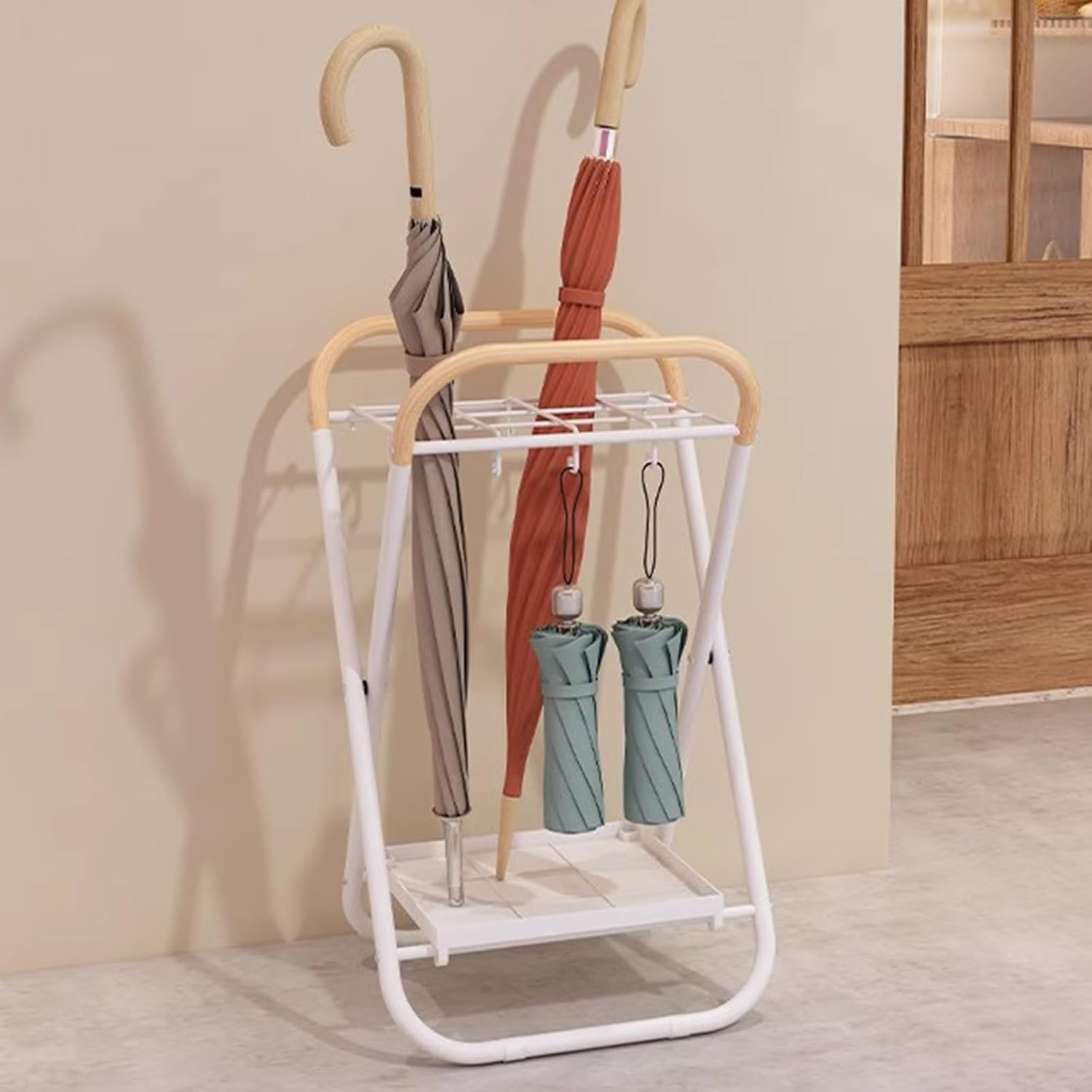 Specifications: Product Name: Umbrella Stand Product Material: Metal Product Color: White + Wood Grain Product Size: 38*34*70cm(15*13*28inch) Package Includes: 1pc*Umbrella Stand This space
