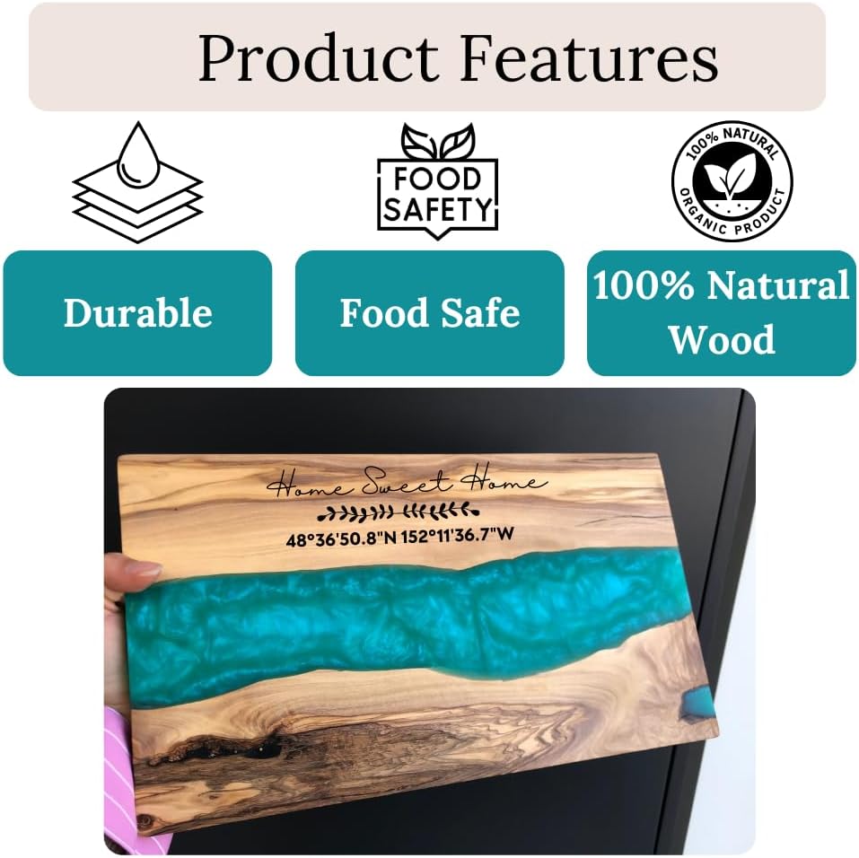 This epoxy resin cutting board is made of olive wood and resin. The olive wood has a special grain, which can sometimes be irregular. It has a slightly coarse texture, and a deep natural shine when worked. All our wood products are food safe. We definitely do not use varnish or any other chemical matter. We only use olive or sunflower oil to our products. Easy to wash: Simply wash the cutting boards with soap and water and put it for drying. Not Just for a cutting board. Performs well as a cheese board and resin charcuterie board. Use this resin cutting board to cut raw meat/ cheese and serve charcuterie. Great as a wedding registry gifts! Perfect for house warming for new home. Gifting it at valentines day, wedding, engagement, housewarming, mother’s day, Thanksgiving day and Christmas. Our cutting boards are available 2 styles: Rectangle 8"x14"x0.6" and rectangle 10"x18"x0.6" HOW TO ORDER -Select your board, color, size and design option. - Then, in personalization box, indicate where your design will be on cutting board. If you want to ask change or request on your order, we are here to help !! Please be aware that due to new regulations, taxes may now apply depending on the destination country (including the United States). Additional customs duties, import taxes, and related fees may apply depending on the destination country. These charges are the buyer’s responsibility and are not included in the item price. Carrier may bill these fees separately and directly to the delivery address after the shipment has been delivered, so be careful when sending gifts directly to the recipient. . In rare cases, customs clearance may cause delays of approximately 3–4 weeks; unfortunately, no refunds can be issued due to customs-related delays. Should you have any further questions, we are always here to assist you.