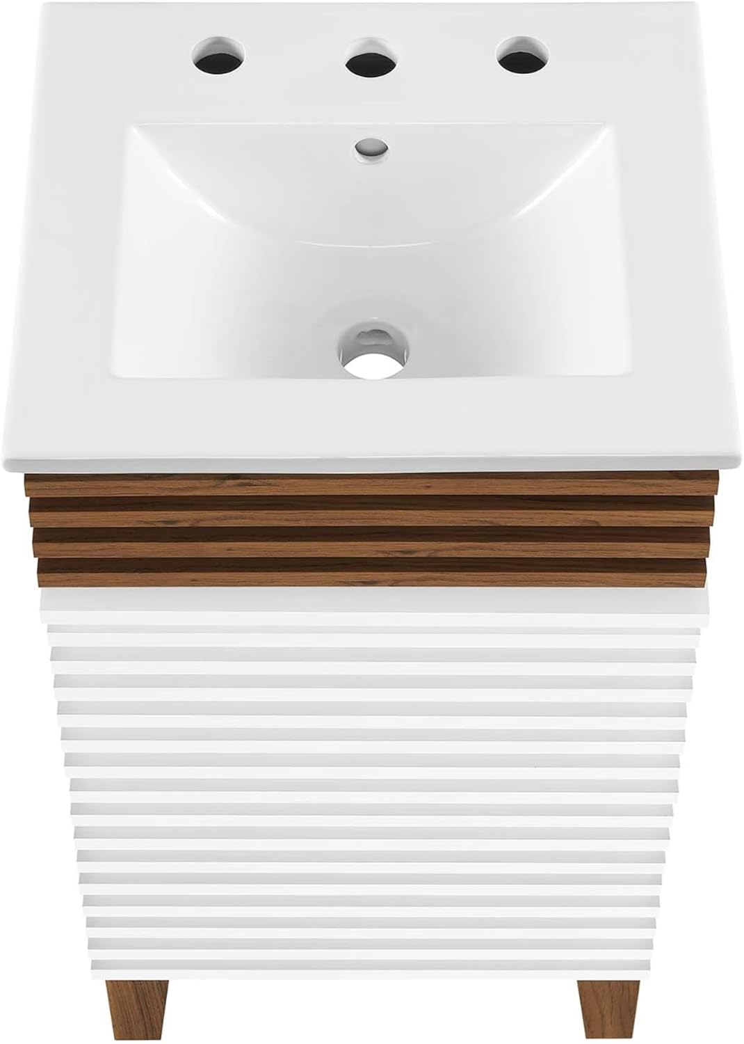 Introducing the Render 18" Bathroom Vanity Cabinet, a perfect blend of mid-century aesthetics and modern functionality. Crafted with a durable particleboard frame and smooth laminate, this vanity exudes a sleek and stylish appeal. The four tapered wood legs add a touch of elegance, while the soft-close hinged door ensures a quiet and smooth operation.Featuring an adjustable storage shelf, you can easily organize your bathroom essentials to keep your space clutter-free. The integrated countertop with a curved ceramic basin adds a touch of sophistication and creates clean lines for a contemporary look. With three faucet holes, this vanity offers versatility and convenience with 8" centerset spacing.Constructed with particleboard and laminate, this vanity is built to last and withstand daily use. Its mid-century modern style adds a pleasing aesthetic to any bathroom decor. Assembly is required, but the end result is well worth it. Please note that fixtures are not included.The Render 18" Bathroom Vanity Cabinet includes one 18" ceramic basin top and one 18" vanity cabinet. The product dimensions are 15.5"L x 18"W x 33.5"H, with the overall basin top dimensions measuring 12.5"L x 14"W x 6"H, and the overall vanity cabinet dimensions measuring 18"L x 15.5"W x 32.5"H. The floor to underside of the table has a height range of 4.5 - 7"H, and the leg dimensions are 11"W.Upgrade your bathroom with the Render Vanity and enjoy its timeless design and practical functionality. Transform your space into a stylish oasis with this mid-century modern masterpiece.