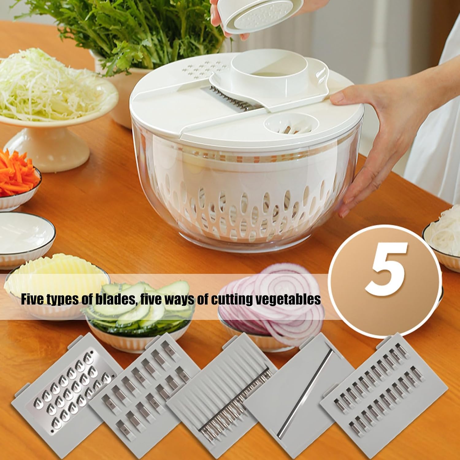 Ergonomic Handle Salad Spinner Base Locking Lid Safe Comfortable Washing Drying 5L Systems Large Bowl Features: This versatile salad spinner a design, integrating slicing, shredding, grating, juicing, and dehydration functions in compact device for efficient vegetable and fruit preparation Featuring a large 4.5 to 5 liter capacity bowl, an easy to use knob for rapid dehydration, a secure lid to splashing, and a not slip base with an ergonomic handle for stable, safe operations Ideal for conscious individuals and home chefs seeking tools for, crisp salads and meal preps without extra effort Perfect for family gatherings or daily cooking, enabling quick washing and drying of whole lettuce and greens to maintain kitchen As a multifunctional kitchen companion, this vegetable slicer and dehydrator enhances culinary efficiency while supporting eating habits Specifications: Materials: ABS+PP+PS+420J2 stainless steel Product size: 24x18cm ( as shown) Capacity: 4.5L ( 5L) Main functions: slicing, shredding, grating, juicing, Package Includes: Salad dehydrator setx1 Note: Pay attention to the storage methods