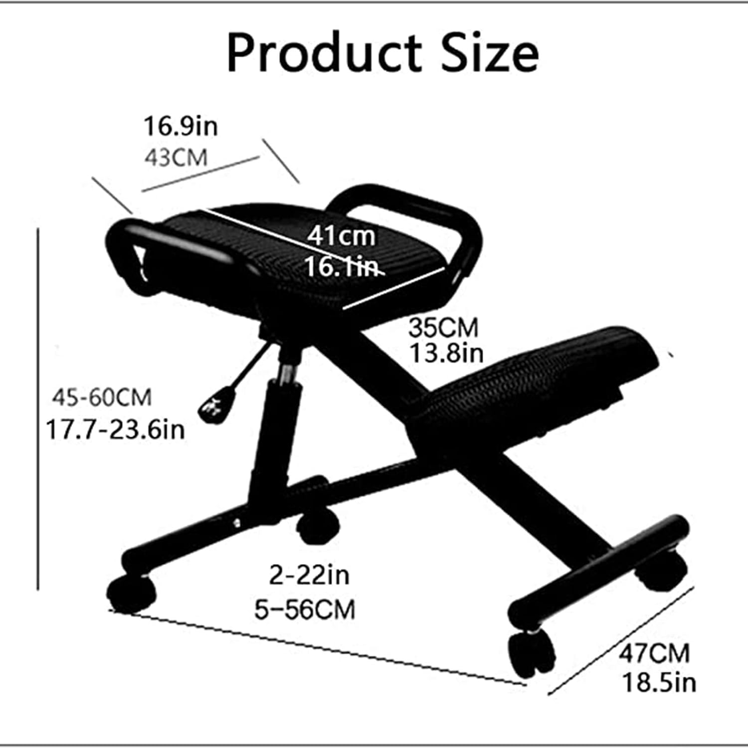 Feature- Take the pressure off your back, neck, shoulders, and vertebra by using this comfortable adjustable kneeling chair.- 45-60CM/17.7-23.6in height with 250 lbs. capacity makes it suitable for most people and the majority desks.- PU material surface and Steel structure allow you quite easy to clean the chair with just one wipe.- The comfort padded cushions made of skin-friendly PU leather and high-density rebound foam and allow you to sit comfortably without sinking through the cushion.- SGS certified hydraulic bar, offering strong and stable support. easy height adjustable.- Removable Casters, There are 4 removable casters, 2 with brake function, which keeps the chair more stable as your safe defender.Product Specifications:Color: Black , Blue , Brown , RedMaterial: PU leather, foam, SteelAdjustable Height: 45-60CM/17.7-23.6 inLoad Bearing: 330 LBS/150KGWeight:12KG/26.5 LbsTips1. Due to the possible color difference of the display, the color display of the product may be inaccurate.2. The pictures have been taken in kind, and the color error of the product may be caused by the shooting light, environment and lighting factors, Please understand3. We provide you with 24-hour customer service. If you have any questions, please contact us in time and we will reply you as soon as possible.