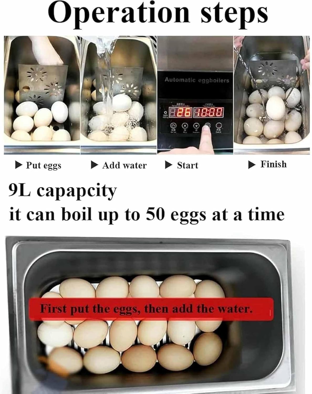 Intelligent automatic egg cooker with timer, commercial slow cooker, 9-liter capacity. Commercial-grade U-shaped thickened heating element for rapid heating and long service life. Built-in intelligent temperature control for better control of the cooking process. Control panel uses intelligent digital control panel for easy and precise temperature control. Specifications: Product Name: Onsen Egg Cooker Heating Method: Intelligent Microcomputer Control Rated Voltage: 220V/50Hz Rated Power: 800W Temperature Control Range: 30-90℃ Timer: 0-99 minutes Product Dimensions: 19*41*29CM Inner Pot Capacity: 9 liters (50 eggs per batch) Suitable Egg Types: Onsen Eggs/Soft-boiled Eggs/Fully Hard-boiled Eggs Package List: Egg Cooker *1