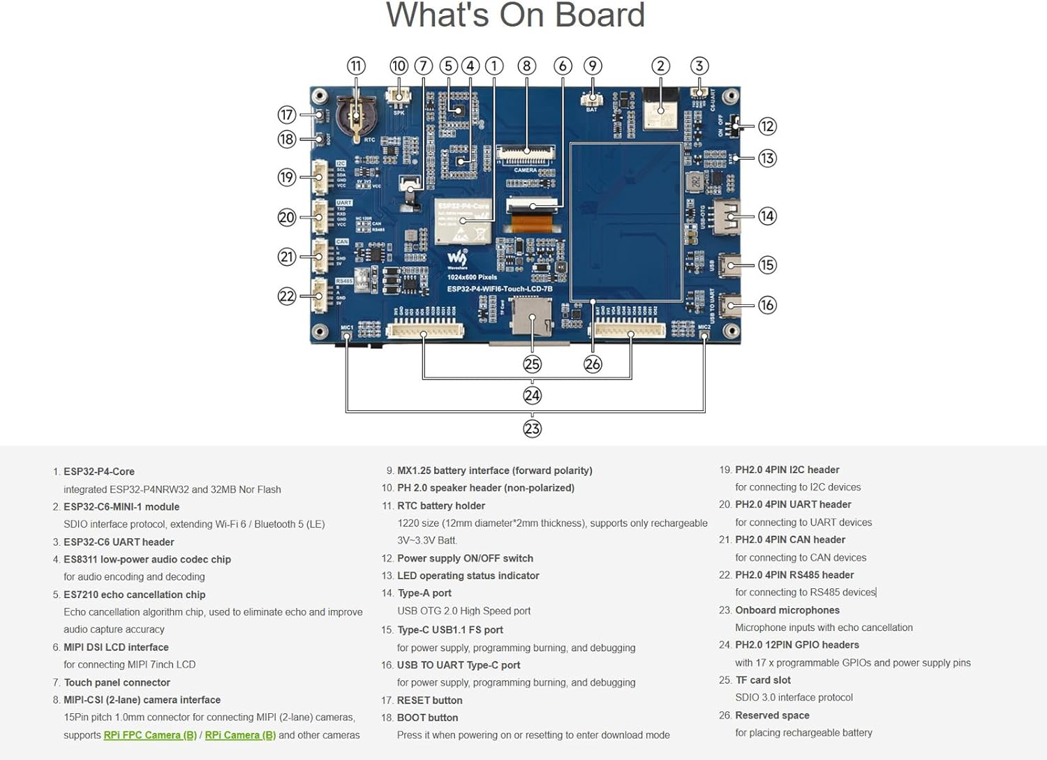 Introduction ESP32-P4-WIFI6-Touch-LCD-7B is a high-performance development board based on ESP32-P4 chip, with integrated RISC-V 32-bit dual-core and single-core processors. Equipped with 7inch 1024 × 600 touch display, features rich human-machine interfaces including MIPI-CSI (with integrated Image Signal Processor), it also supports USB OTG 2.0 HS for high-speed communication. Features High-performance MCU with RISC-V 32-bit dual-core and single-core processors 128 KB HP ROM, 16 KB LP ROM, 768 KB HP L2MEM, 32 KB LP Static RAM, 8 KB TCM 32MB PSRAM in the chip's package, with onboard 32MB Nor Flash Equipped with 7inch IPS touch screen, 160° wide viewing angle, capacitive 5-point touch, 1024 × 600 resolution, 16.7M color, 350cd/m² brightness Powerful image and voice processing capability. Provides image and voice processing interfaces including JPEG Codec, Pixel Processing Accelerator, Image Signal Processor, H264 encoder Commonly used peripherals such as MIPI-CSI, MIPI-DSI, USB 2.0 OTG HS, SDIO 3.0 TF card slot, dual microphones (supports echo cancellation), speaker header and RTC battery holder, etc. Adapting 2*12 GPIO header with 17 x remaining programmable GPIOs Onboard RS485, CAN, I2C, and UART headers for easy communication with industrial equipments Security features: Secure Boot, Flash Encryption, cryptographic accelerators, and TRNG. Additionally, hardware access protection mechanisms help to enable Access Permission Management and Privilege Separation Package Content ESP32-P4-WIFI6-Touch-LCD-7B x1 USB Type-A dual-plug cable x1 USB Type-A to Type-C cable ~1m x1 Speaker x1 SH1.0 4PIN cable ~150mm x1 PH2.0 12PIN cable ~200mm x2 PH2.0 4PIN cable ~200mm x4 Note: Online Dev Resources and Tutorials to help you easily get started. Please feel free to contact us with any questions.