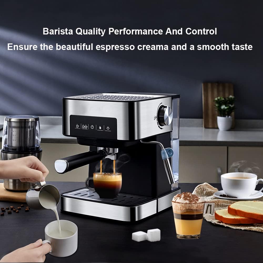 Semi-Automatic 2-in-1 Espresso Coffee Maker with milk wand, whatever your preference, Choose your strength with Classic Espresso, Cappuccino, or producing steam to heat liquids or beverage. It will provide rich and silky coffee for you at home and office. 【Feature】 - Various types of Coffee, with steam function. - Making perfect milk foam,Strong steam. - 850W high power, high efficiency. - Professional heating cup area. - Scald-proof, easy to clean. - 20Bars pressure pump,Pressure Display. - Electronic temperature control technology. - Pre-soaking function. - Independent hot water outlet. - Works 8-10 hours continuously. - 2 seconds pre-soaking time,Improve the flavor of Espresso and increase the extraction rate. 【Triple protection】 - Automatic temperature control protection: high temperature automatically stops working - Overheating protection device: automatically cut off power in case of dry burning - Automatic pressure relief device: automatic pressure relief when the air pressure of the machine is too high. 【Specification】 Voltage: 220V 50Hz 850W Capacity: 5~10cups, water tank: 1.6L Pressure: 20bar Net weight: about 3.6kg Product size: 270x234x292mm 【Package Contents】 1× Espresso Machine Note Please check the dimensions before purchase. When first using, preheat may take a long time and the espresso may not hot enough. The second time will be better. At first foaming, the steamer need some time to preheat. The pressure is different between steam and coffee process. We recommend to wait for the temperature down after using steamer, then brew coffee. The steam may still remains inside the portafilter after brewing, so the extra coffee will slowly drip out, we suggest that wait 15~20s after turnning off. Please use this product according to the operating instructions.