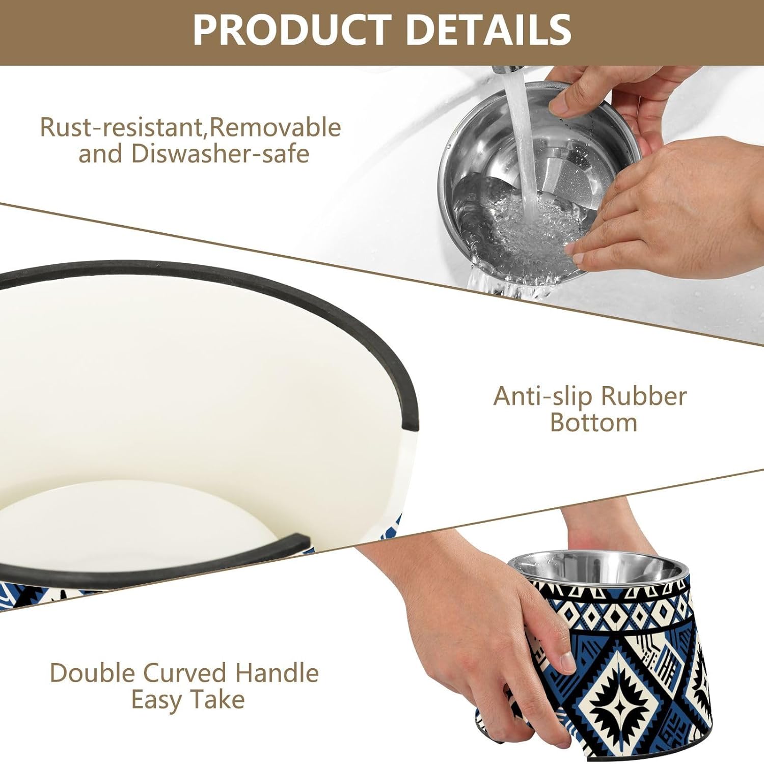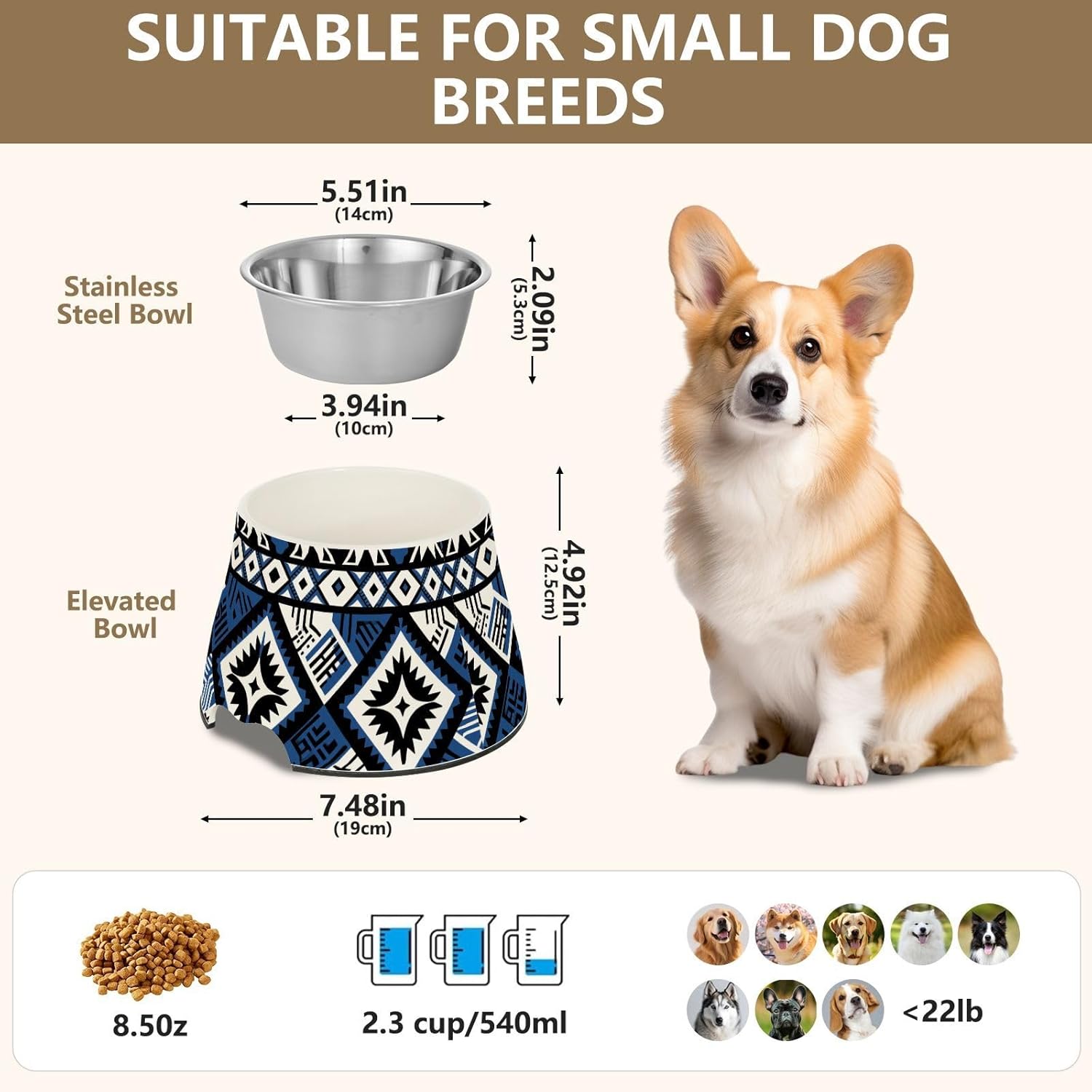 Material: Melamine + Stainless Steel. This Pets Feeding Bowl has a silicone anti-slip strip at the bottom and features an anti-tipping design to prevent your pet from sliding back and forth while eating.Size: High Bowl: 7.48 x 4.92 inches; Stainless Steel Bowl: 3.94 x 5.51 x 2.09 inches. Raised Cat Bowl is suitable for small pets.Product Design: Outer layer of this Raised Cat Bowl increases the height of the bowl, which can to some extent reduce the burden on the neck of elderly dogs, dogs with muscle or joint problems.Fashionable Presents for Pet Lovers: Looking for the right present for pet lovers? This personalized patterned Pets Feeding Bowl makes a thoughtful and practical present for the new owner of your beloved pet, birthdays, festivals or any pet-themed occasion.Warm Reminder: This Raised Cat Bowl comes with two accessories. Please check them carefully after receiving the goods. If you have any questions, please contact us by email. Our customer service will answer your doubts!
