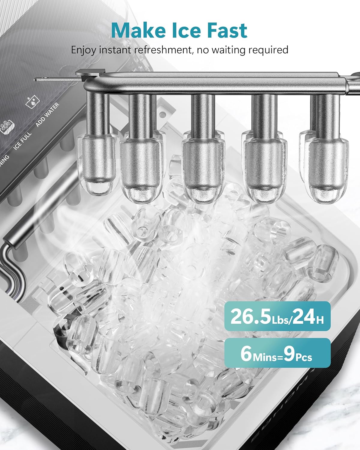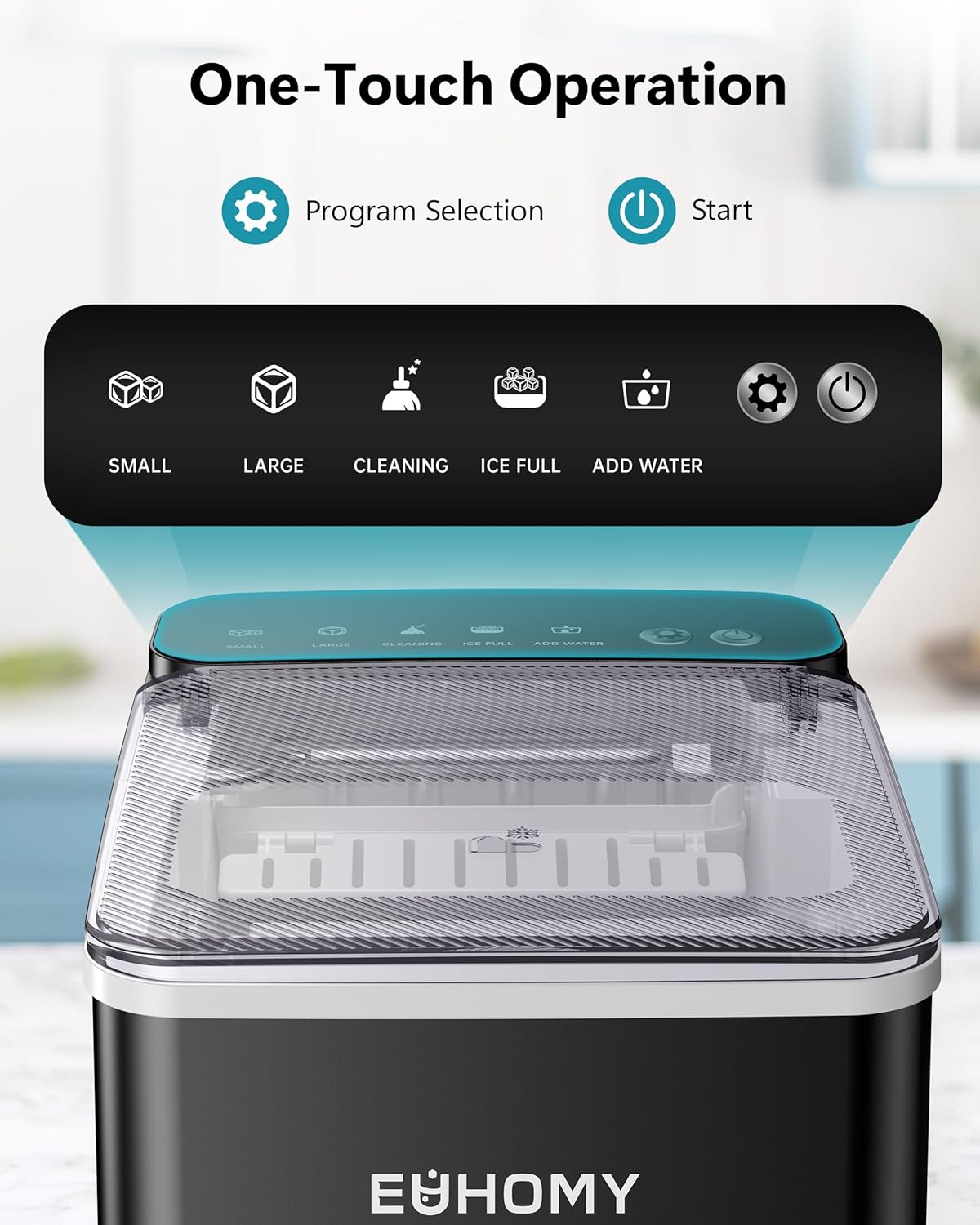 New Control Panel Design – Easy Operation The EUHOMY compact ice maker features a newly designed control panel. With just a simple press of a button, you can easily switch between Large Ice, Small Ice, and Auto-Cleaning modes. Designed for user-friendliness, making it easy for both seniors and kids to operate.