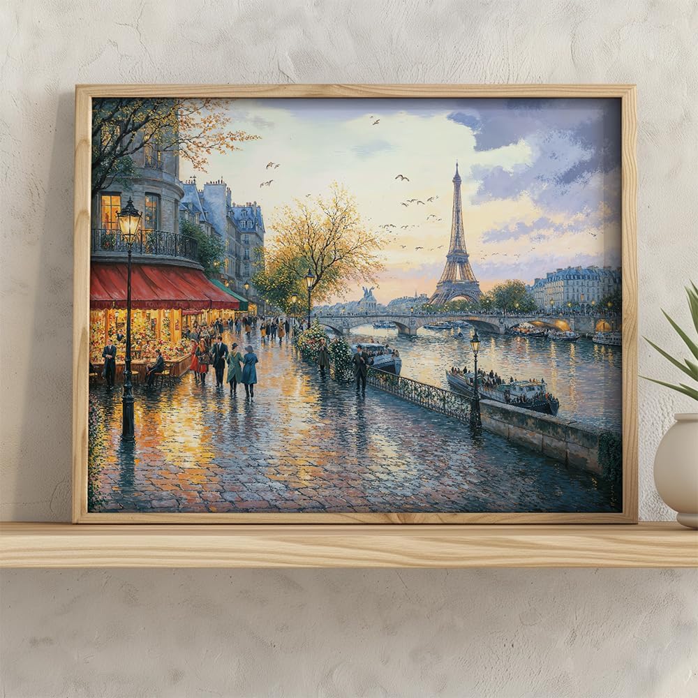 | Product Style | Evening Stroll Paris: Eiffel Tower Seine River Sunset Painting, Scenic Street, Parisian Cafe Art |