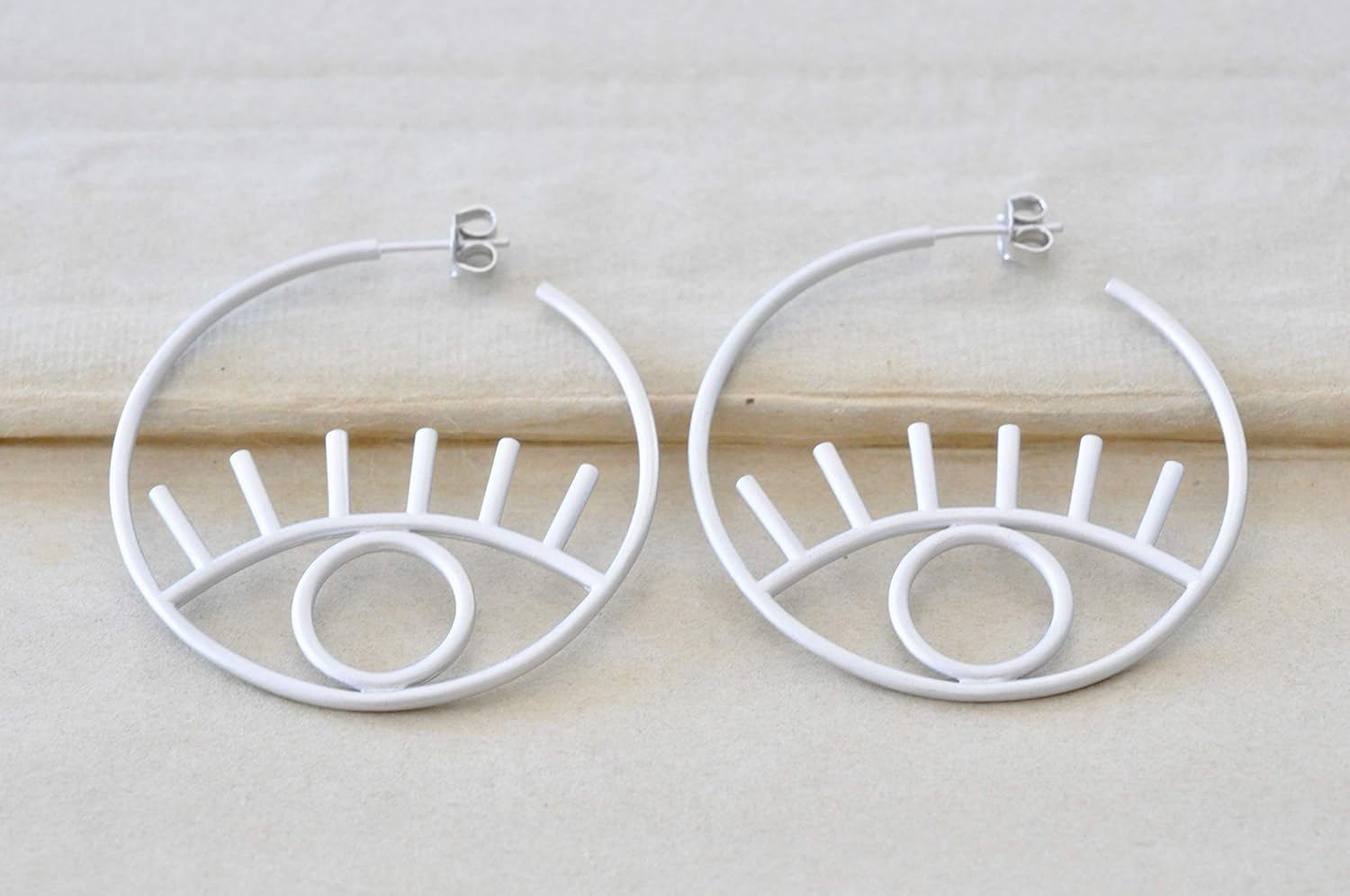 Evil Eye Inspired Hoop Earrings Beautiful earrings guaranteed to spark conversations! These unique "hoop" earrings are finished in a subtle matte silver. ***NOTE: I've changed the closure to a regular post with butterfly backing as pictured in the product photos. The model is wearing the old style closure. The earrings are exactly the same.