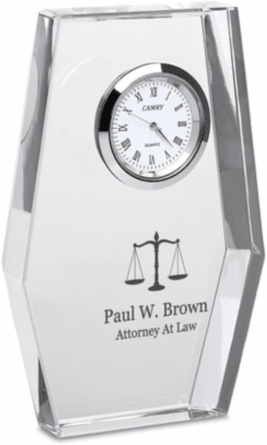 Solid Crystal base with inlaid quartz movement clock. White dial with black numbers and hands. Crystal base has beveled edges. Free laser engraving on the crystal below the Lawyer emblem. Packaged in a gift box. Dimensions: 4.75" Height x 3.1" Width x .9" Thickness.