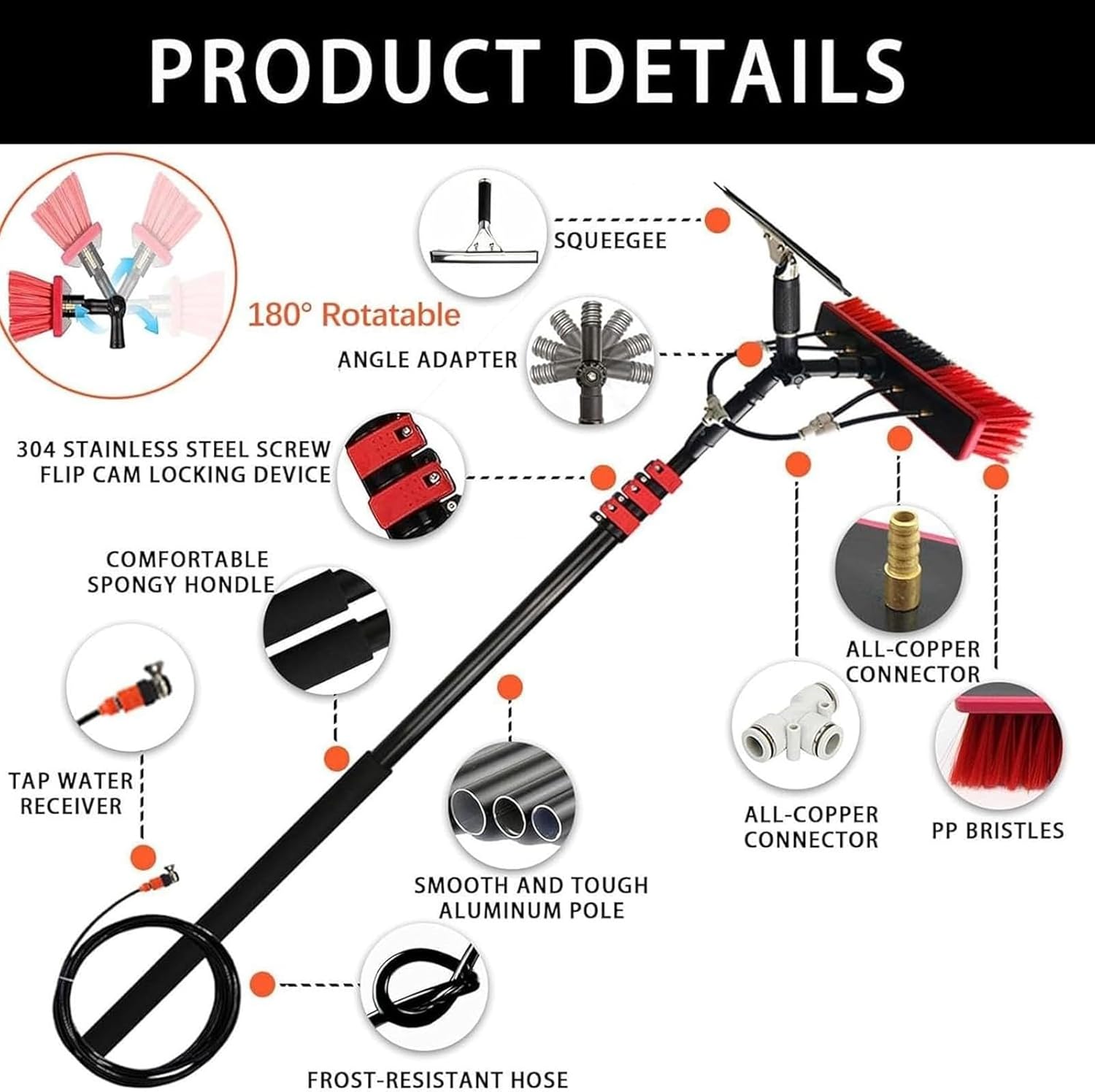 Introducing our Outdoor Window Glass Solar Panel Cleaning Brush, an essential tool for maintaining the cleanliness and efficiency of your solar panels and other surfaces. Designed with versatility in mind, this 3 to 15-meter extendable telescopic pole allows you to tackle hard-to-reach areas without the need for a ladder, making it a safe choice for all users. **Key Features:** 1. **Versatile Application:** This water-fed pole kit is ideal for cleaning solar panels, conservatory roofs, house siding, vehicles, boats, decks, and patios. No matter the surface, you can achieve a thorough clean with ease. 2. **Efficient Cleaning Performance:** Equipped with four powerful water jets, our cleaning brush ensures a deep clean. The built-in soap dispenser with a dosing button allows you to quickly apply soap, resulting in spotless surfaces without the hassle. 3. **Adjustable Angle:** The 180° rotatable brush head lets you effortlessly clean various angles from the ground, providing flexibility and convenience for all your cleaning tasks. 4. ** and Lightweight Materials:** Crafted with soft PP bristles, our water-fed brush is gentle on surfaces while providing effective cleaning. The telescopic pole is made from sturdy yet lightweight aluminum, weighing only 0.25 kg, making it easy for anyone to handle. **Product Specifications:** - Length of Single Pole: 1m - Brush Width: 35cm - Water Hose Length: 20m Whether you're maintaining your home's exterior or ensuring your solar panels are operating at peak efficiency, our cleaning brush is the perfect solution. If you have any questions or need assistance, feel free to reach out, and we will respond within 24 hours. Get ready to experience a new level of cleaning convenience!