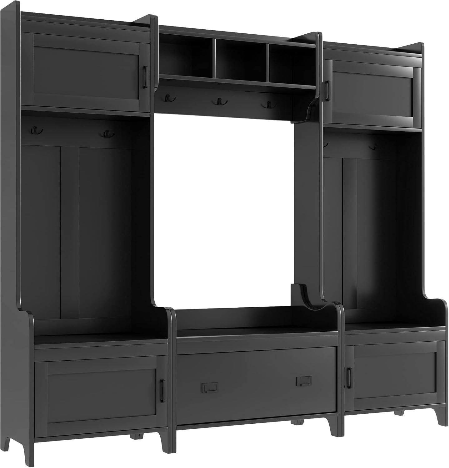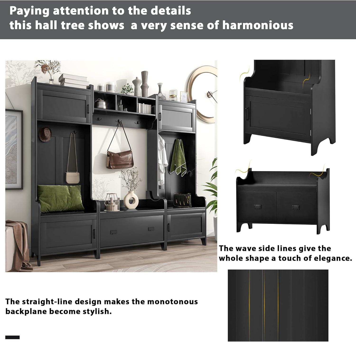 This modern style hall tree combination meets the dual requirements of beauty and storage in daily life. The beautiful lines and exquisite design on the appearance of this hall tree combination reflect the attentive investment in the design. The features that can be freely combined further expand the use of this hall tree combination, and that can meet the needs of more different scenarios.Specifications:Color: White, BlackMaterial: Particle board+ MDFAdditional Tools Required (Not Included): Power Drill recommendedDimensions:Overall Dimension: 78.7''W x 15''D x 72''HWeight Capacity: 400 lbsPackage:Numbers of package: 2Overall Package Weight: 169.65 lbsCountry of Origin: ChinaWarranty time: 1 YearNotes:1. Manual measurement has been used, there may be some reasonable error.2. All the pictures are taken by actual samples, slight chromatic aberration may occur due to lighting or display.