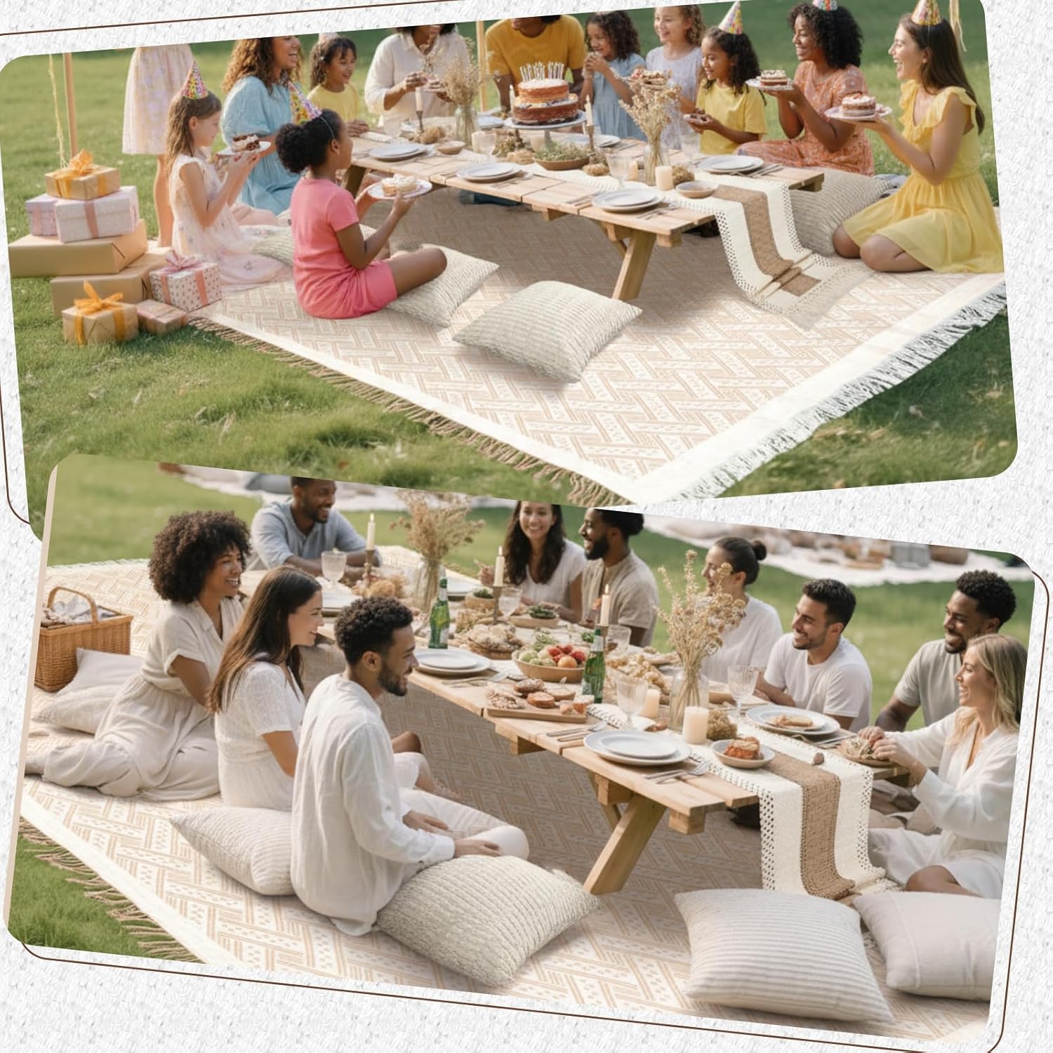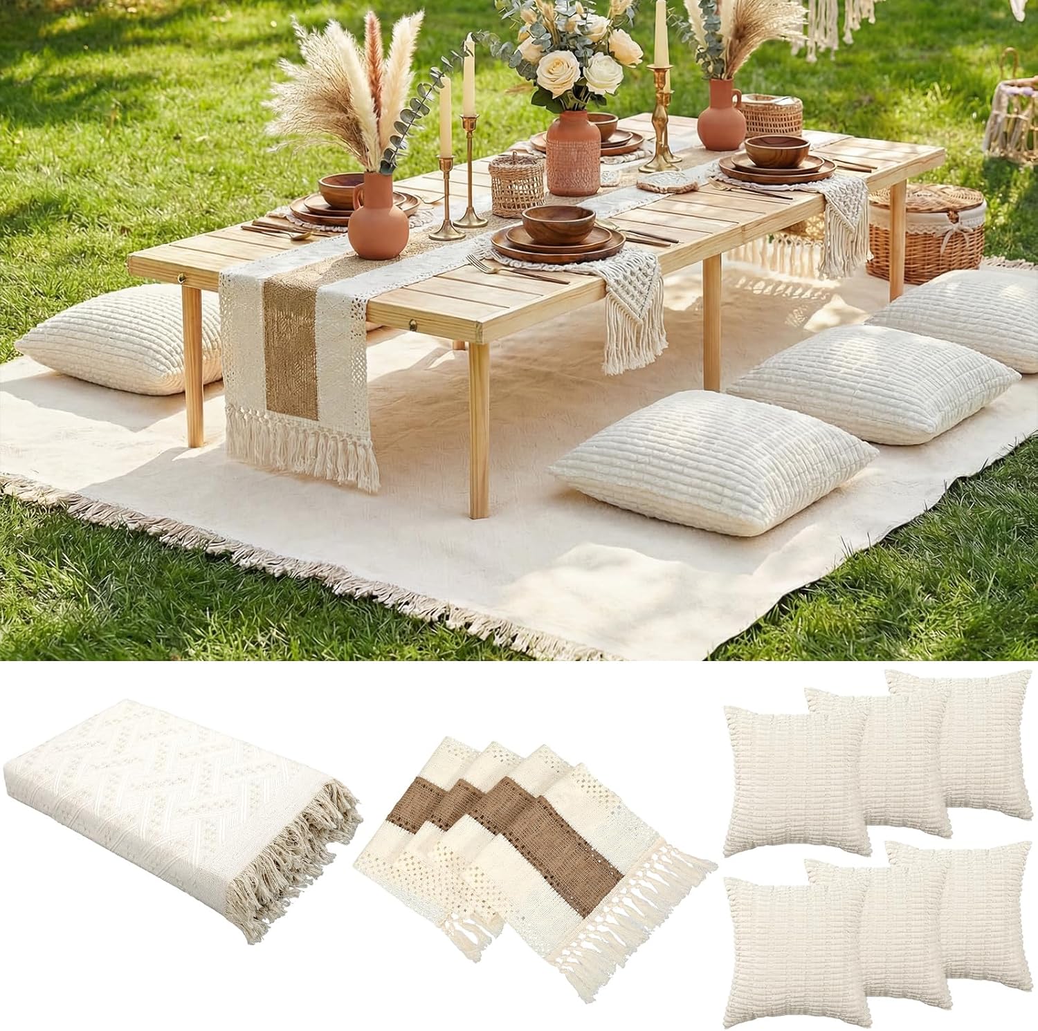 Features: Our farmhouse table runners and blanket can be applied as restaurant decorations, bedroom decorations, flat on desks, storage tables, coffee tables and other surfaces, and can be applied for multiple people to sit and enjoy outdoor fun, providing spacious and comfortable space for family outings, beach parties, friends gatherings or camping trips. Since the table runners and picnic mats are folded in the packaging bag, creases may appear when they are taken out, which will affect the measurement results. Therefore, please make sure that the table runners are neatly laid out before measuring. Despite their large size, blankets and table runners are easy to carry and suitable for many outdoor activities. They can be folded compactly for easy carrying. Table runner specifications: Material: polyester, Linen, Cotton Size: about 12 x 72 inches/30 x 183 cm Blanket specifications: Material: woven cotton yarn Size: about 181 x 71 inches /460 x 180 cm Pillow cover specifications: Material: plush Size: 17.72 x 17.72 inches Color: main in beige and white Package includes: 1 x Table runner 1 x Blanket 6 x Pillow covers Notes: Manual measurement, please allow slight errors on size. The color may exist a slight difference due to different screen displays