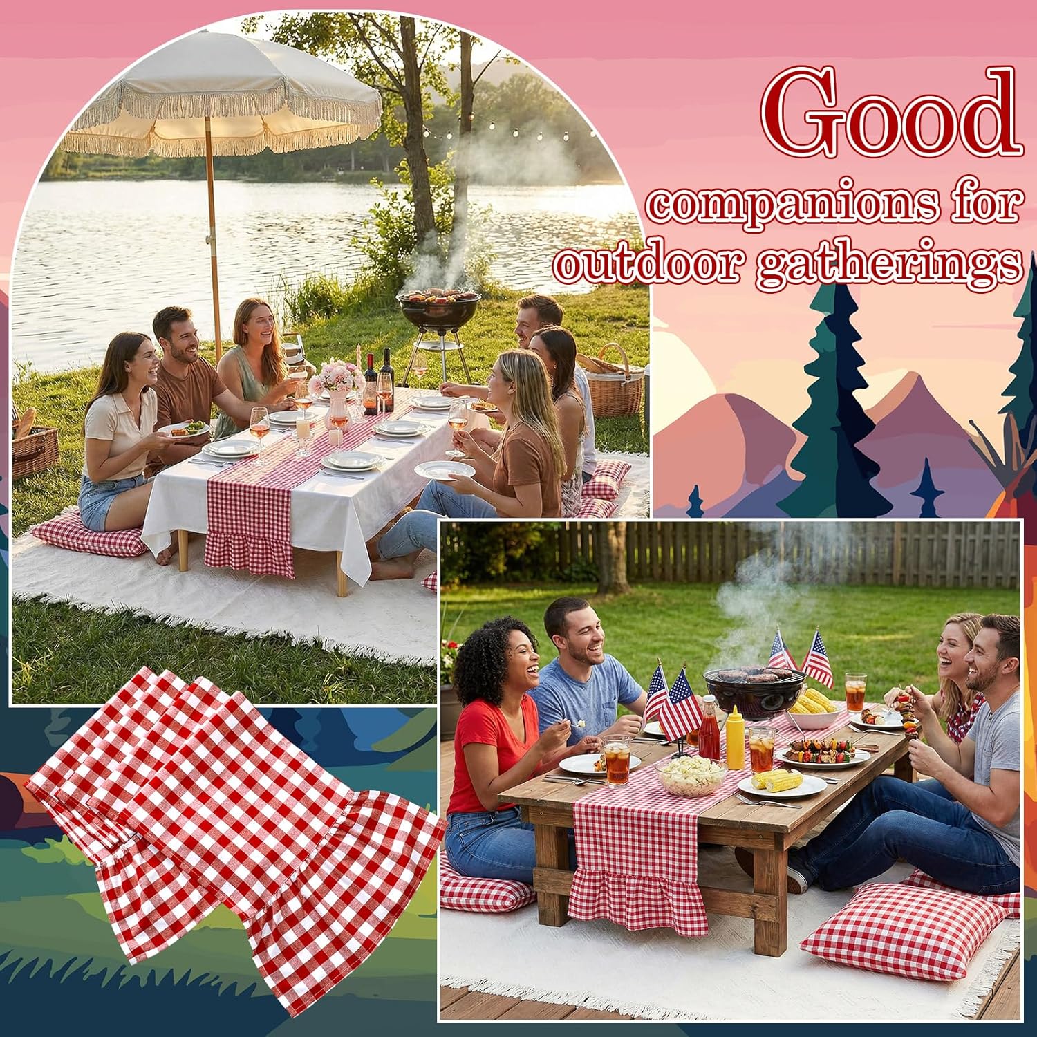 Features: This set provides a complete outdoor solution. It comes with 6 red plaid pillow covers (17.7"x17.7" each, insert not included), instantly adding comfort and coordinated style for your party seating. Designed for lasting use, the thick, woven cotton fabric of the boho picnic blanket and the blended material of the table runner resist wear, ensuring your decorative set remains beautiful for many events. Specifications: Material: cotton, linen, polyester blend Color: Size: Picnic blanket: 91" L x 71" W. Table runner: 157" L x 35.5" W Pillow cover: 17.7" x 17.7" Package includes: 1 x Oversized picnic blanket 1 x Plaid table runner 6 x Plaid pillow covers (insert not included) Notes: Manual measurement, please allow slight errors on size. The color may exist a slight difference due to different screen displays