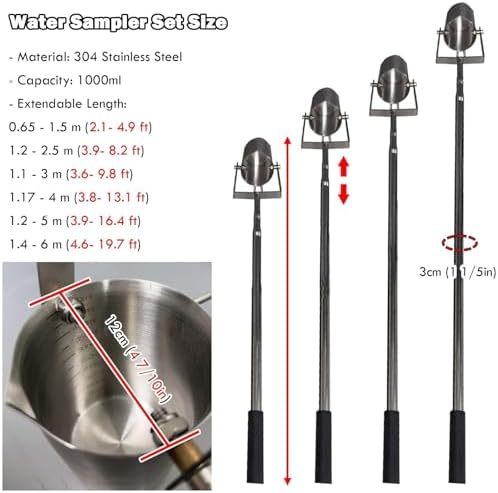 Introducing the Telescopic Pole Water Quality Sampler, designed for those who need a reliable solution for sampling water from rivers, lakes, ponds, and more. This innovative sampling tool addresses the challenge of reaching distant water sources, making it an ideal choice for environmental studies, recreational activities, and water quality monitoring. Crafted from durable 304 stainless steel, our water sampler ensures longevity and resistance to damage. The beaker opening measures 12 cm (4.7 in) and has a generous capacity of 1000 ml, allowing you to collect ample samples with ease. The pole features a diameter of 3 cm (1.2 in) and comes in various extendable lengths, ranging from 0.65 m (2.1 ft) to 6 m (19.7 ft), accommodating various sampling scenarios. Key features include its lightweight and portable design, making it easy to carry to any location. The flexible rotation capability allows for versatile water collection in hard-to-reach areas. Whether you're conducting research, fishing, or monitoring local water quality, this telescopic pole water sampler is both convenient and efficient. Each package includes one telescopic pole and one water collecting cup, providing you with everything needed for effective sampling. Please note that slight size deviations may occur due to manual measurement, and product appearance may vary slightly from images due to display and lighting conditions. Elevate your water sampling experience with our Telescopic Pole Water Quality Sampler and ensure you can collect samples wherever your adventures take you.