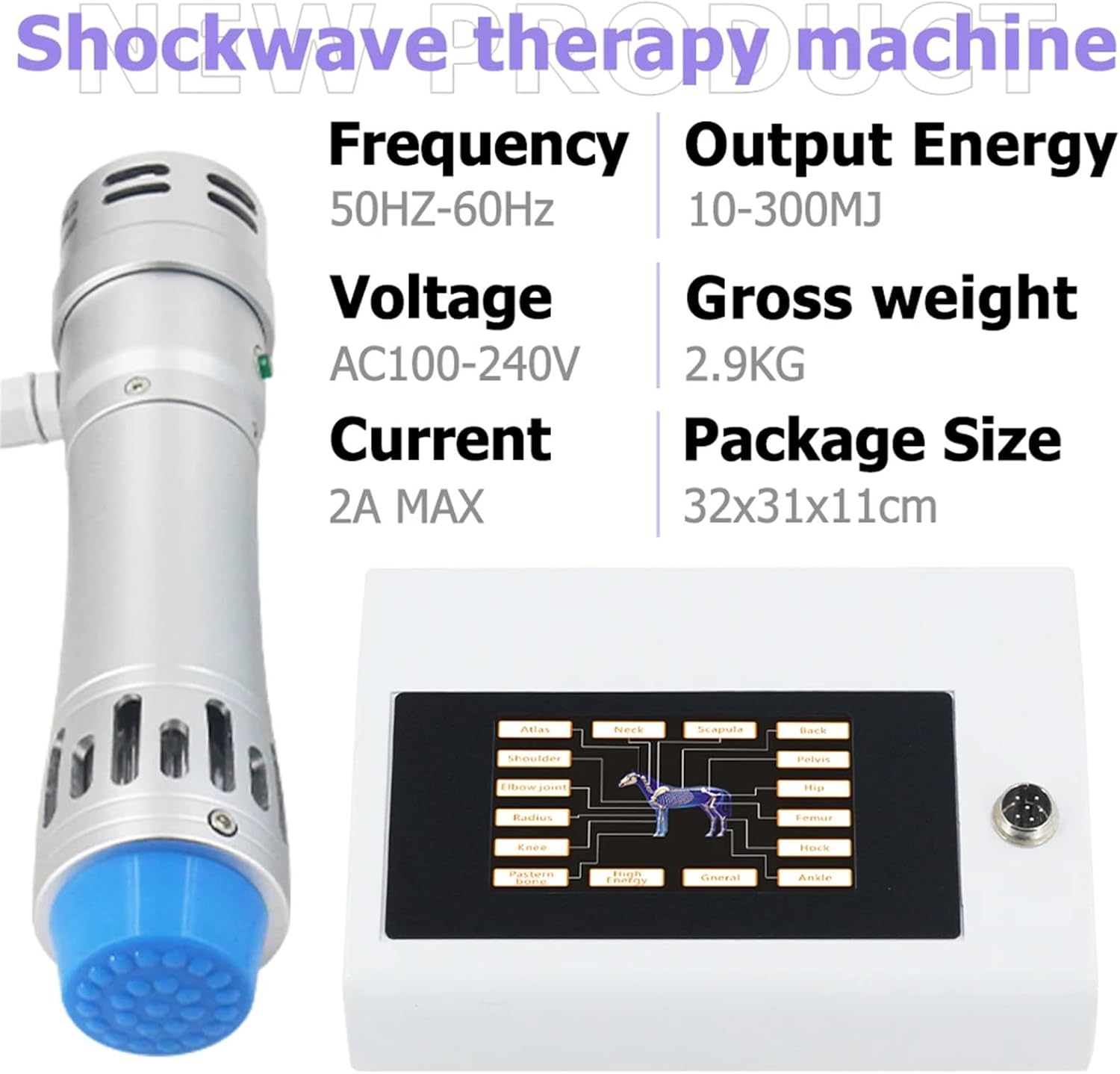 Shockwave therapy principle: Extracorporeal shock wave therapy has become an emerging new technology for treating musculoskeletal problems, soft-tissue injuries and bone injuries in horses. This is non-invasive, used to stimulate healing to return horses to a level of fully sound, useful activity without recurrence of disease. Shockwave therapy for horses / animal is a great alternative to drugs and their side effects. It works on chronic and acute conditions,providing relief without the risks of steroid treatments or further injury. With shockwave therapy, you can ensure your horse's / animal comfort and well-being with a safe and effective treatment. Say goodbye to harmful drugs and hello to a better way of healing with shockwave therapy. Applications: Shockwave have been successfully used to treat many soft issue, muscle injury, tendon injury ect on horses and other animals. -Suspensory Ligament Branch. -Collateral Ligaments Of Various Joints. -Nuchal Ligament. -Arthropathy / Cubarthrosis. -Muscle triger points – Sciatica, myositis, fibrosis. -Chronic Back Pain. -Hip And Elbow Dysplasia. -Tendinopathy Equine shockwave therapy machine for horses. -Painful Scar Tissue. Specification: Item Type: Shockwave Therapy Machine for Horses Frequency: 50HZ/60HZ Current: 2A Maximum Output Frequency Gear: 18 Output Energy Level: 300mj Maximum Number of Working Heads: 7 Gross weight:2.9kg Product size: 29.5*26*18.5cm