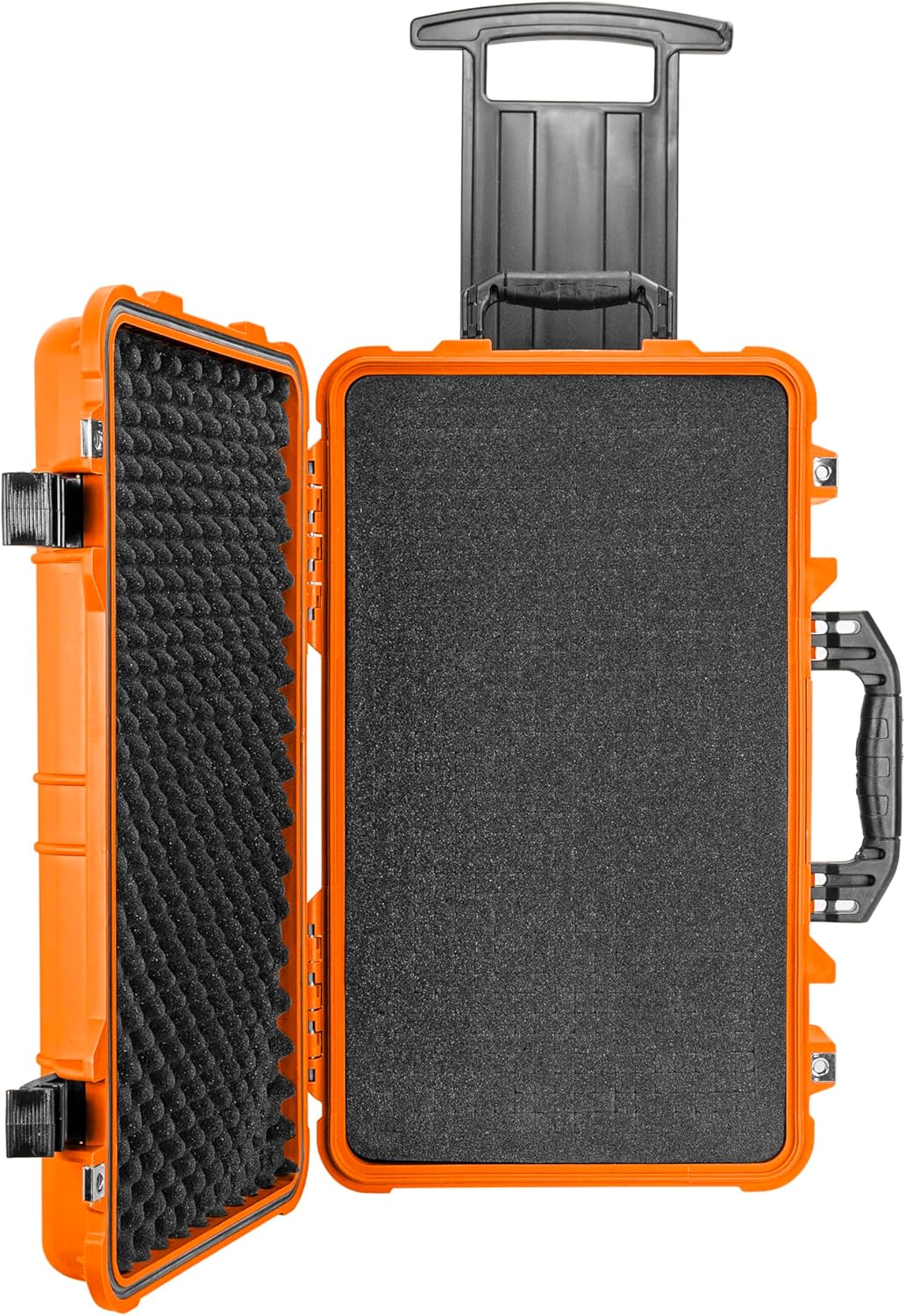 The Eylar 22" large hard carry-on case is perfect for protecting camera equipment and drones during travel. External dimensions are 22" x 13.81" x 9" and internal dimensions are 19.75" x 11" x 7.6", fitting standard overhead compartments and meeting TSA requirements. Constructed from high-pressure polypropylene plastic, this IP67-rated waterproof and shock-resistant case includes four layers of customizable foam, roller travel wheels, a retractable pull handle, and a pressure equalization valve. It features two padlock adaptable hasps, secure snap latches, and can withstand extreme temperatures (-20°F to 140°F). Backed by a limited lifetime warranty.